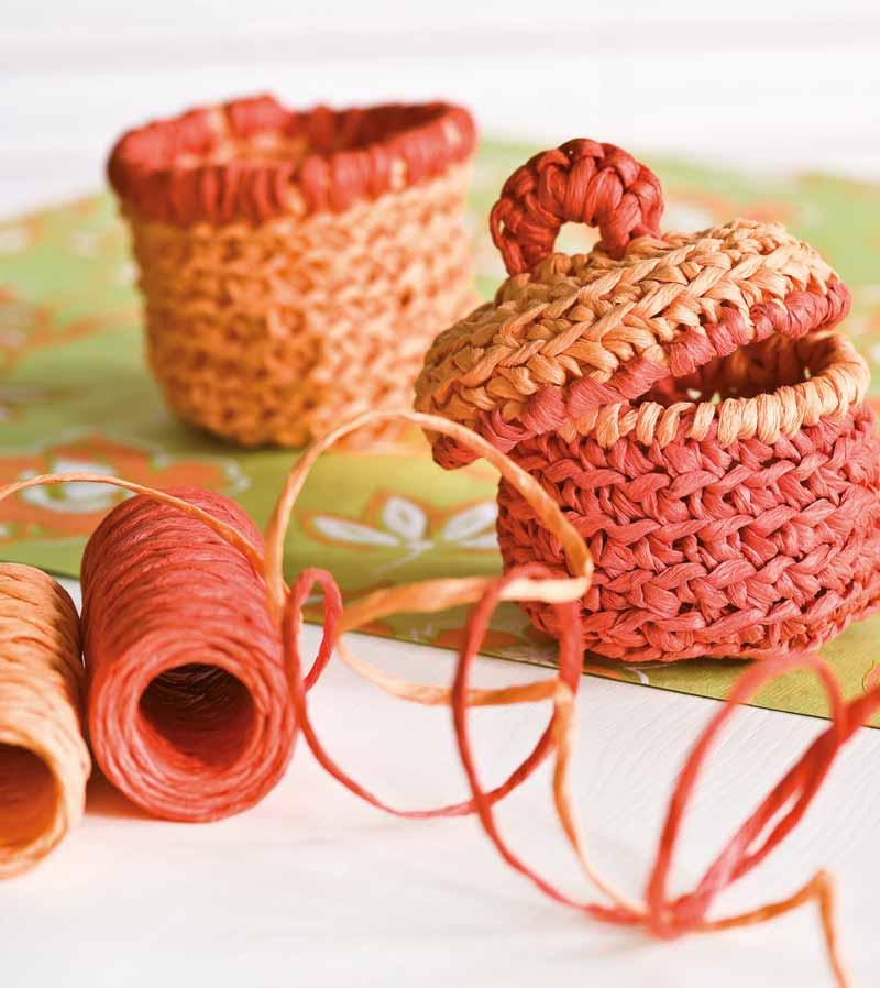 Die Dosen häkelst du wie die Blüten von Seite 14 in Runden. Du machst eine Anfangsschlinge und häkelst zwei Luftmaschen. Dann häkelst du acht feste Maschen in die zweite Luftmasche von der Nadel aus. Du häkelst weiter in Spiralrunden. Das heißt, du schließt die Runde nicht mit einer Kettmasche, sondern häkelst die erste feste Masche der neuen Runde in die erste feste Masche der alten Runde. Damit du erkennen kannst, wo die Runde anfängt, legst du einen andersfarbigen Faden zwischen letzte Masche der ersten Runde und erste Masche der zweiten Runde.