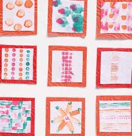 Bei diesem Stoff werden mit einem Bleistift Muster in Moosgummirechtecke geritzt. Das sind die Stempel. Am besten legst du die feinen Linien nach dem Aufnehmen der Farbe mit dem Bleistift noch einmal frei. Außerdem wurde überschüssige Farbe vor dem Stoffdruck mehrfach auf einem Schmierpapier abgestempelt. Dadurch entsteht der leicht verwaschene Eindruck.