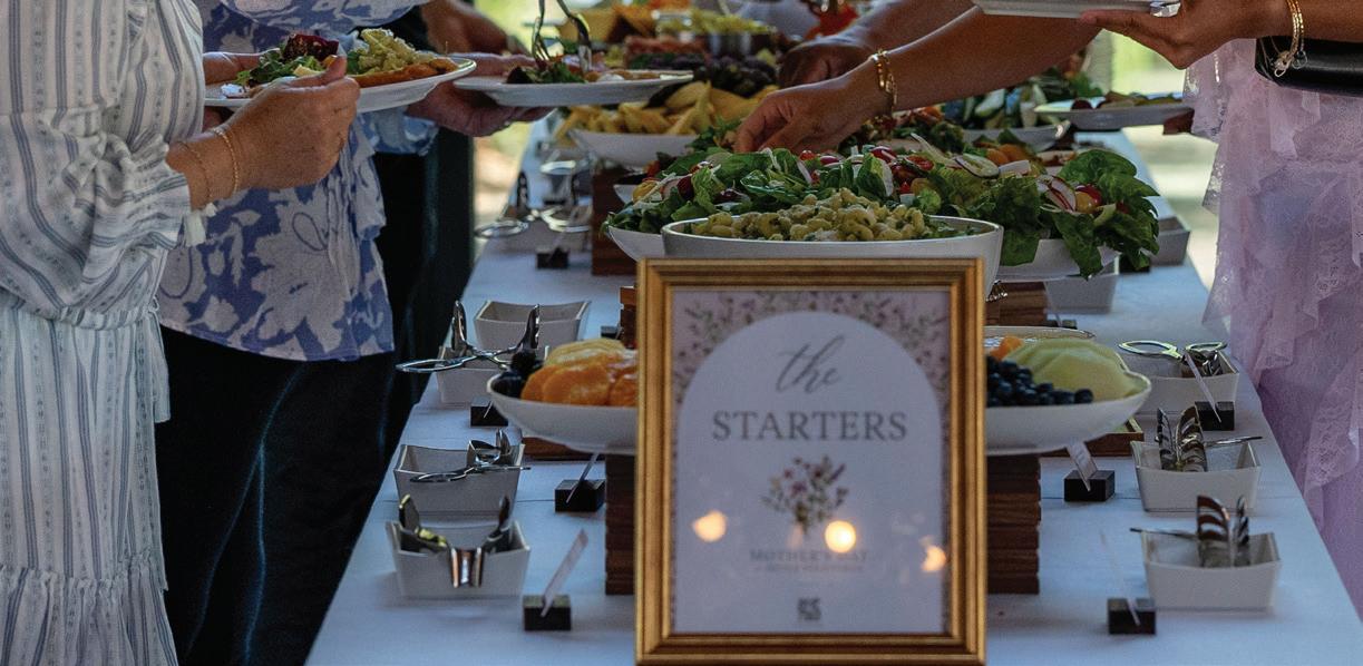 Guests made their way into the lounge to the brunch buffet where Chef Erik prepared traditional brunch offerings of assorted pastries, eggs Benedict, individual crab and spinach frittatas, potato home fries, country sausage patties, applewood-smoked bacon, creamy hominy grits, and the chef’s famous mini coffee crumb cakes. Party revelers lunched at the intimate 24-foot table enrobed with the aforementioned floor-length, black silk tablecloth embroidered with silver and gold vines and adorned with black decorative Italianate ceramic urns; sterling silver pedestal fruit bowls filled with seasonal fresh fruit; silver trays and serviceware; stunning pink peonies, pink roses, ranunculus, black dwarf calla lilies, and other florals in hues of pink, grown and beautifully arranged in sterling silver cachepots and crystal pedestal vases by talented farmer and florist Bonnie Lummis. Guests were welcome to pink organza favor bags filled with “Aubrey’s Bloody Mary Crunch,” a curious blend of Bloody Maryflavored almonds and peanuts, spicy sesame sticks, dill pickle cashews, and zesty TajÍn® (chili-lime) flavored pistachios specially blended by the host, Aubrey Brewster, for guests to snack on later.