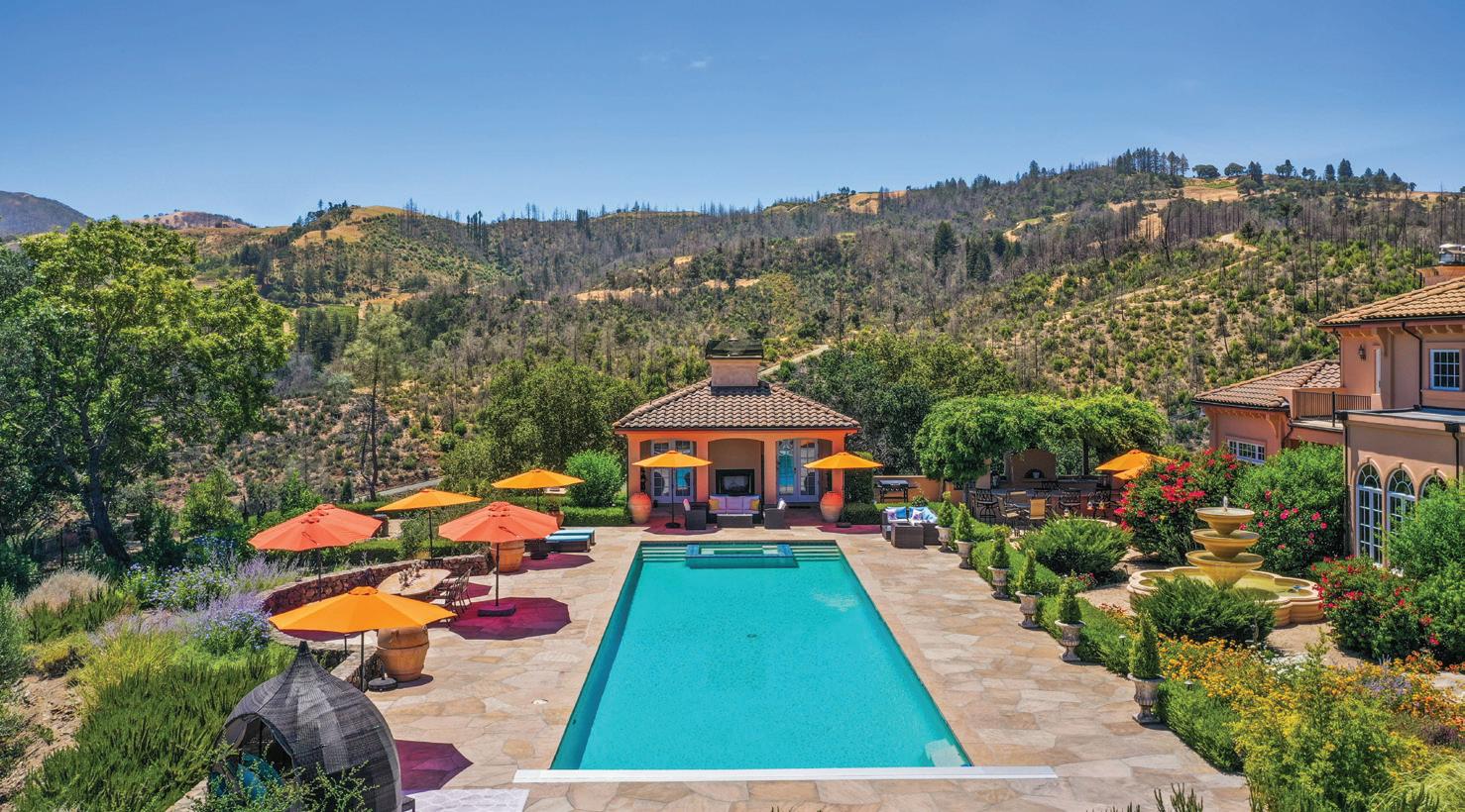 2900 Spring Mountain on 14.94 acres features a main house with high-end finishes, soaring ceilings, 5 bedrooms, 5.5 bathrooms, a wine cellar, 5 car garage, a grand motor court, an 80 feet pool, an outdoor kitchen, a pizza oven with dining bar, tasting room, an one bedroom one bath Guest House, lush gardens with greenhouse, koi pond, and vegetable garden.
