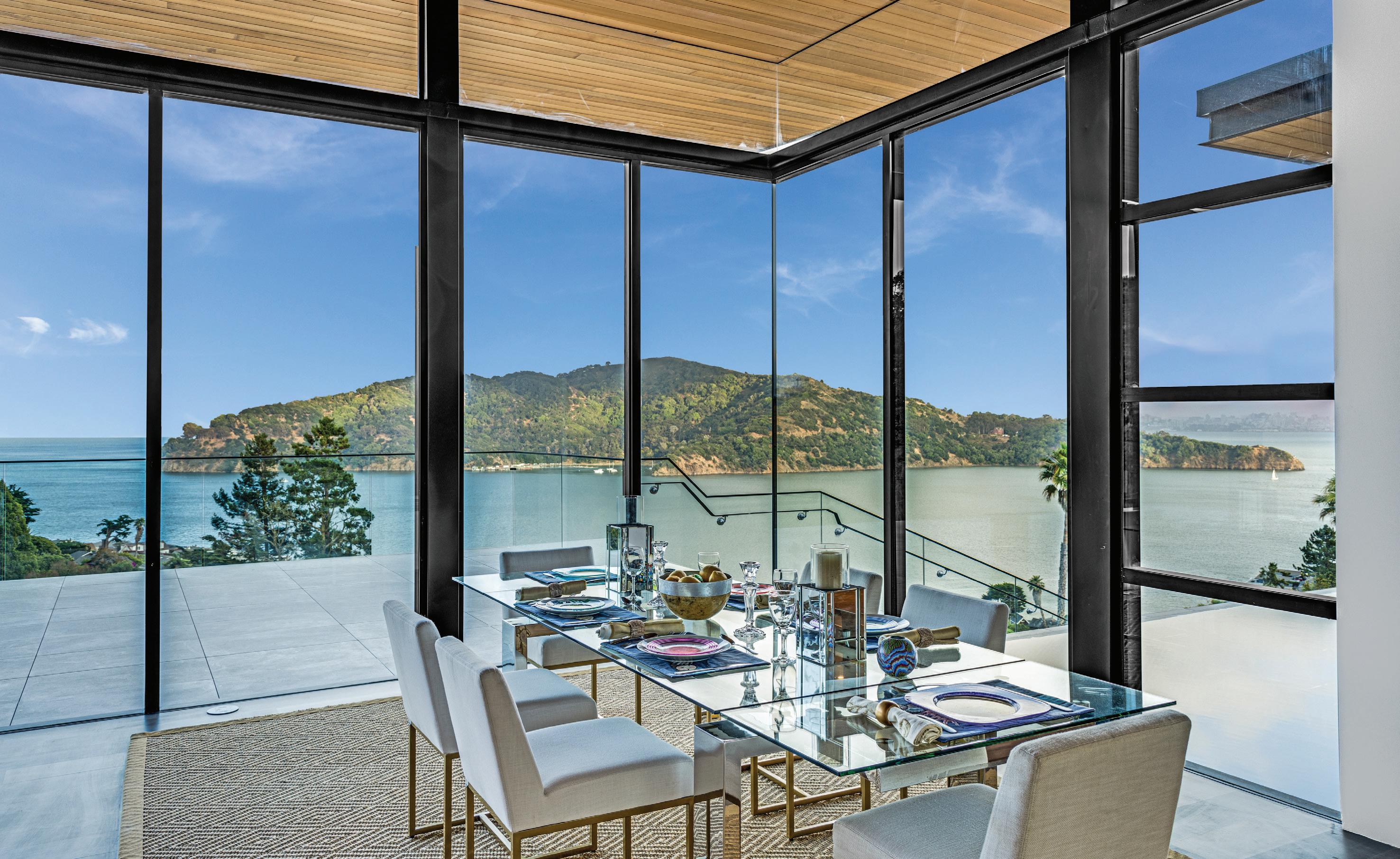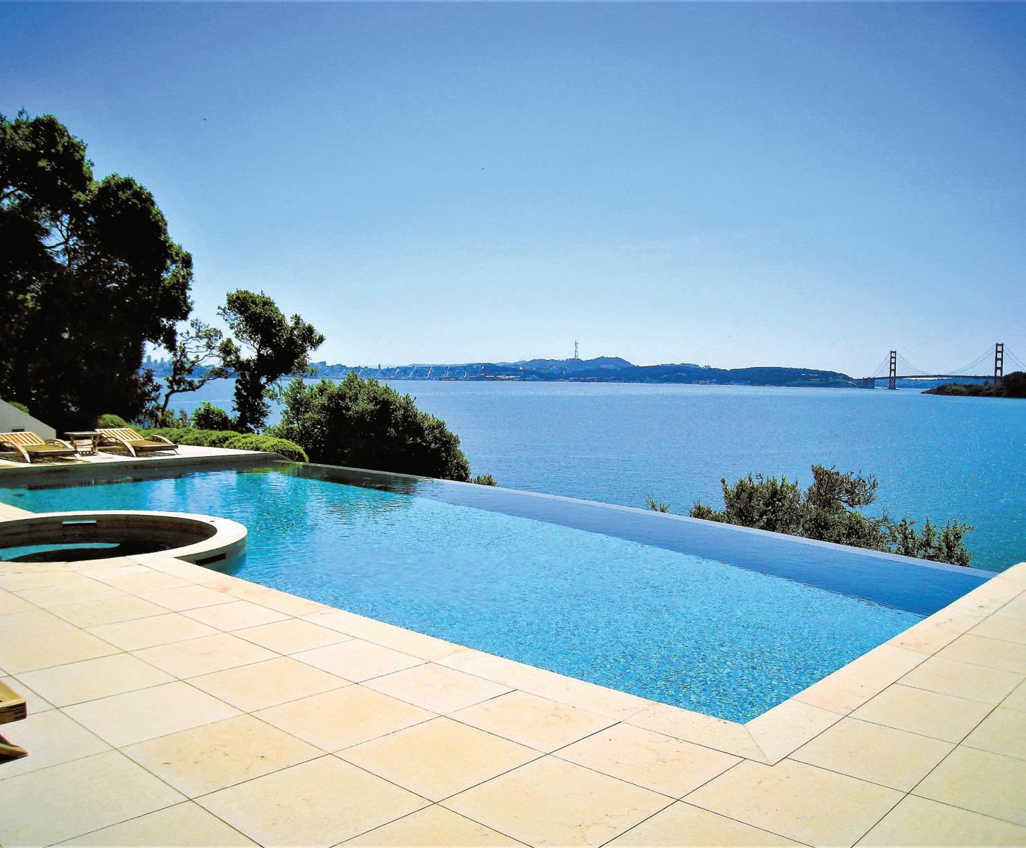 Featured in Architectural Digest, this world-class residence showcases panoramic views of the San Francisco Bay, the Golden Gate Bridge, the skyline of San Francisco and Sausalito. This magnificent masterpiece in a dramatic setting on the most prestigious location is comprised of a ±8,131 sq .ft. home on a ±0.67 acre lot, featuring 4 bedrooms and 5.5 baths. This architectural work of art was designed by architect Charles Gwathmey, with spectacular outlooks from every corner of the expansive 4-level floor plan. The primarily vertical organization of this home takes advantage of its sloped site on the southern coast of Belvedere Island. The uppermost level contains a 3-car garage with glass doors, an elevator which descends to a courtyard, a detached one bedroom, one bath guesthouse and a spacious wine cellar. The remaining levels of the main house are situated between two large retaining walls, which follow the natural contours of the site and splay outwards towards the Bay. The house’s compact organization within the precinct formed by the retaining walls ensures privacy. An interior circular stair winds around an elevator and forms the cylindrical focal point of the house’s massing. A barrel-vaulted ceiling articulates the living and dining room at the entry level of the main house, and a large deck projects towards the Bay to extend the space into the landscape. 3 bedrooms, 3 baths, a study and a two-story entertainment room occupy the intermediate floors, while a media room, a beautiful wet bar, a full bath with steam shower and sauna on the lowest level open onto a spacious outdoor terrace with a pool, whose “infinity edge” of water establishes a poetic connection to the Bay. The interior floors are limestone and wide plank Bubinga wood and cabinets are lightly stained maple. The exterior is clad in gray stained cedar, with a curved standing seam zinc roof. All exterior windows, doors and decks are teak, all terraces are beige/gray flamed limestone pavers and the retaining walls are painted warm white stucco. This is one of the very rare large size newer contemporary homes on Belvedere Island on south and west facing waterfront.
