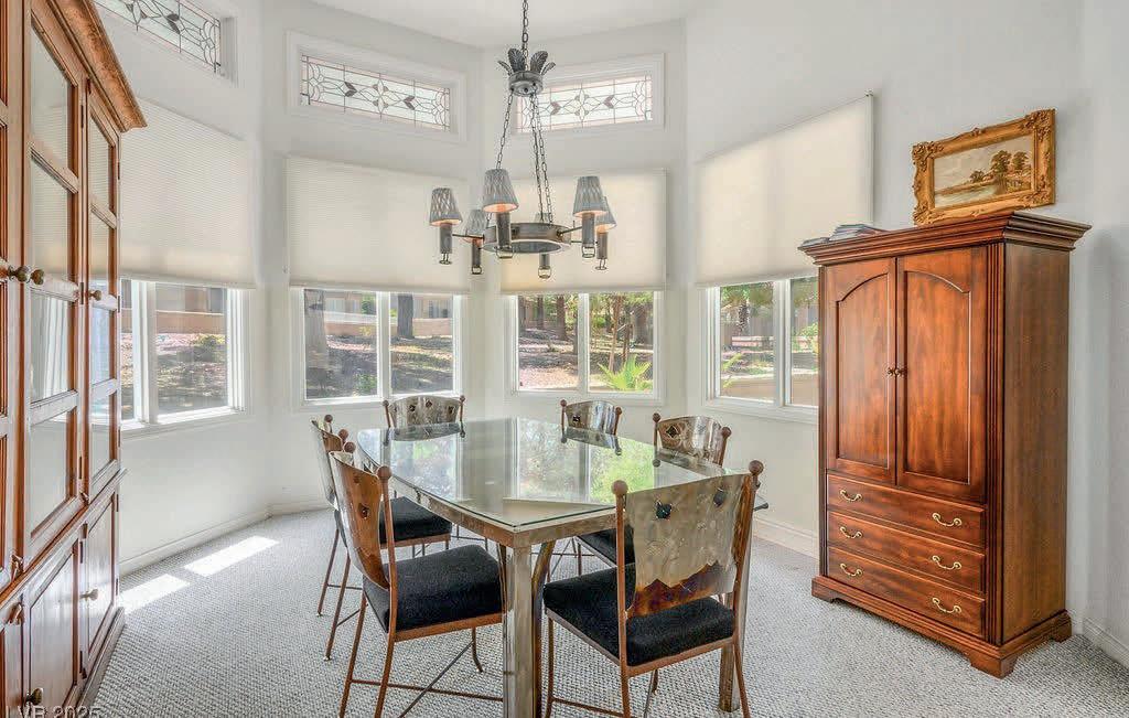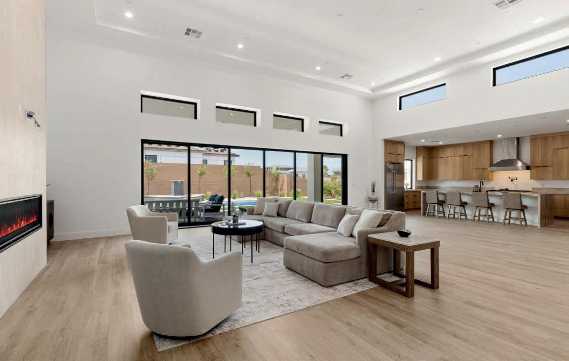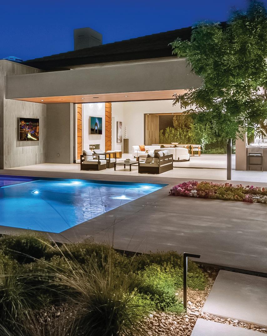 Enjoy sweeping mountain and Strip views from a private backyard oasis featuring a 600 sq ft pool and spa, outdoor kitchen with BBQ, and firepit lounge. Inside, soaring 16-ft ceilings and clerestory windows flood the home with natural light, framing four en suite bedrooms and six baths for effortless luxury and privacy.