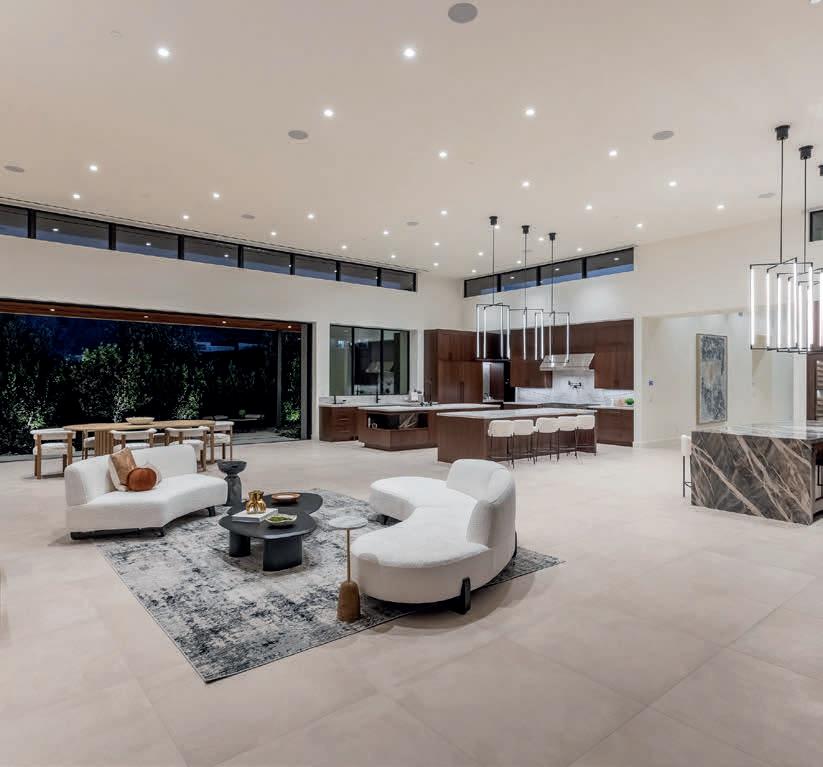 Finishes include American Black Walnut cabinetry and doors, silver travertine, Italian porcelain flooring, and disappearing pocket doors that blur indoor-outdoor living. The chef’s kitchen boasts Sub-Zero/Wolf appliances and dual 224-bottle wine refrigerators.