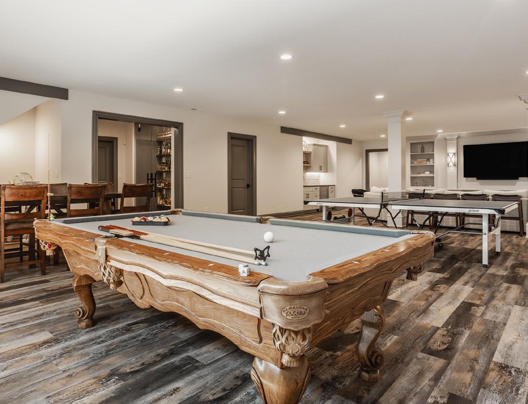 Thoughtfully designed for both everyday living and effortless entertaining, the open-concept floor plan flows seamlessly from the gourmet kitchen and prep space to the dining area and great room. A floorto-ceiling stone gas fireplace and custom built-ins anchor the great room, while the chef’s kitchen boasts an oversized island, Sub-Zero and Wolf appliances, a gas range beneath a striking custom hood, and a fully equipped catering kitchen. A builtin bar—with dual tap, refrigerated drawers, and wine fridge—makes hosting a breeze.