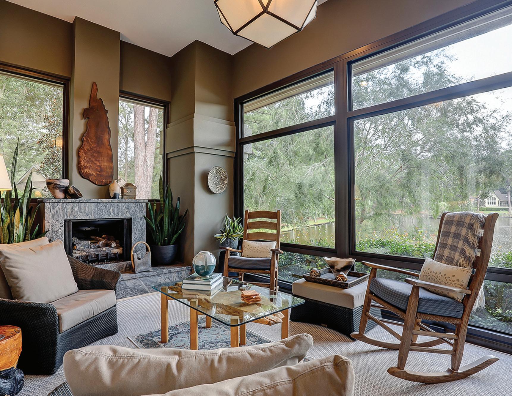 Timeless Elegance Meets Artisan Craftsmanship: Admire the exquisite details—Cypress ceilings, Rosewood inlays, White Oak flooring, and Teak accents—complemented by a majestic twostory Stone and Copper-clad Fireplace.