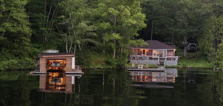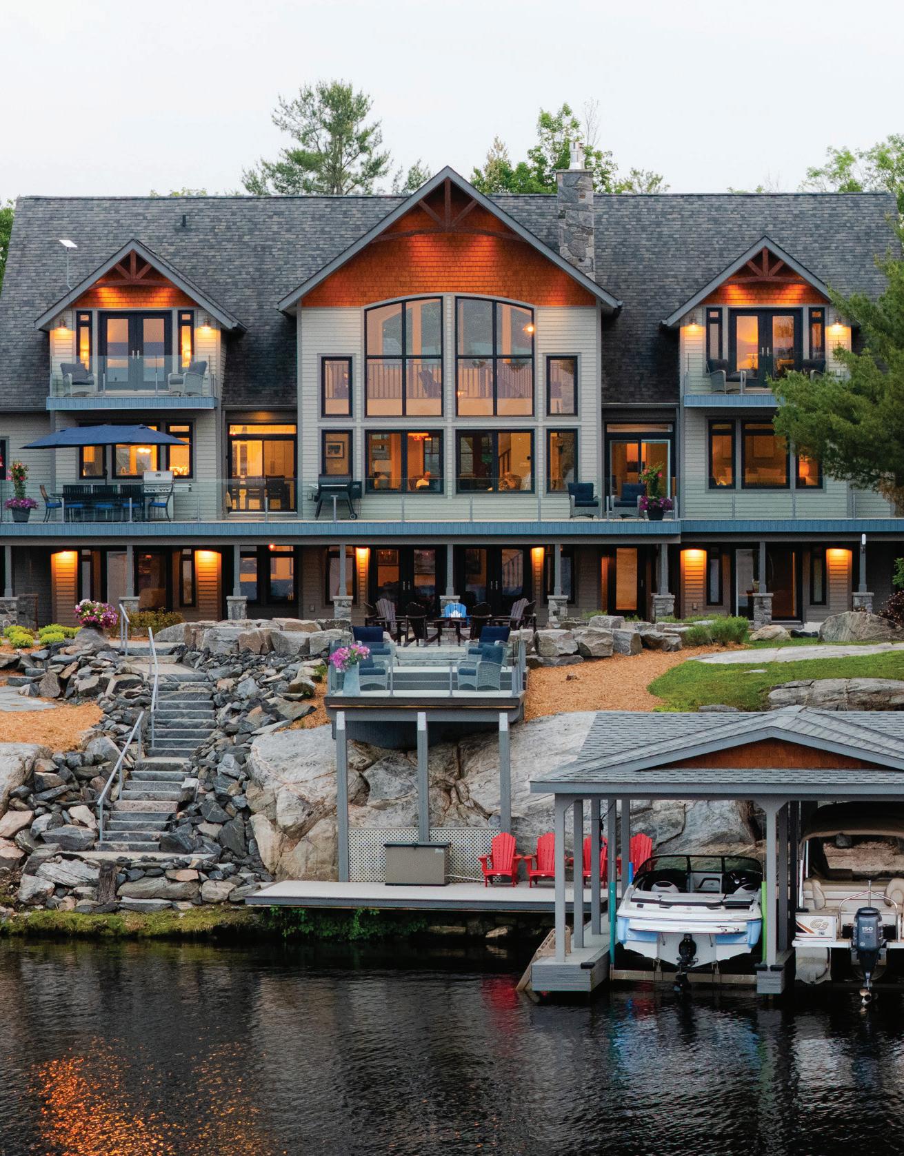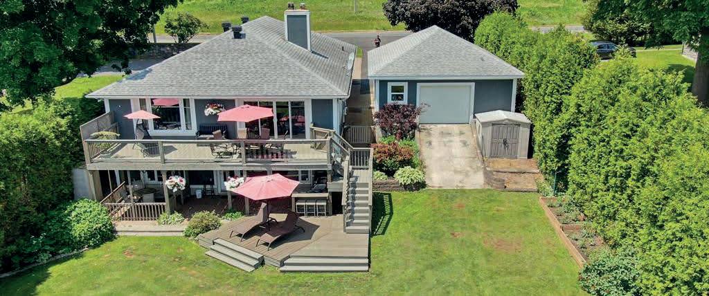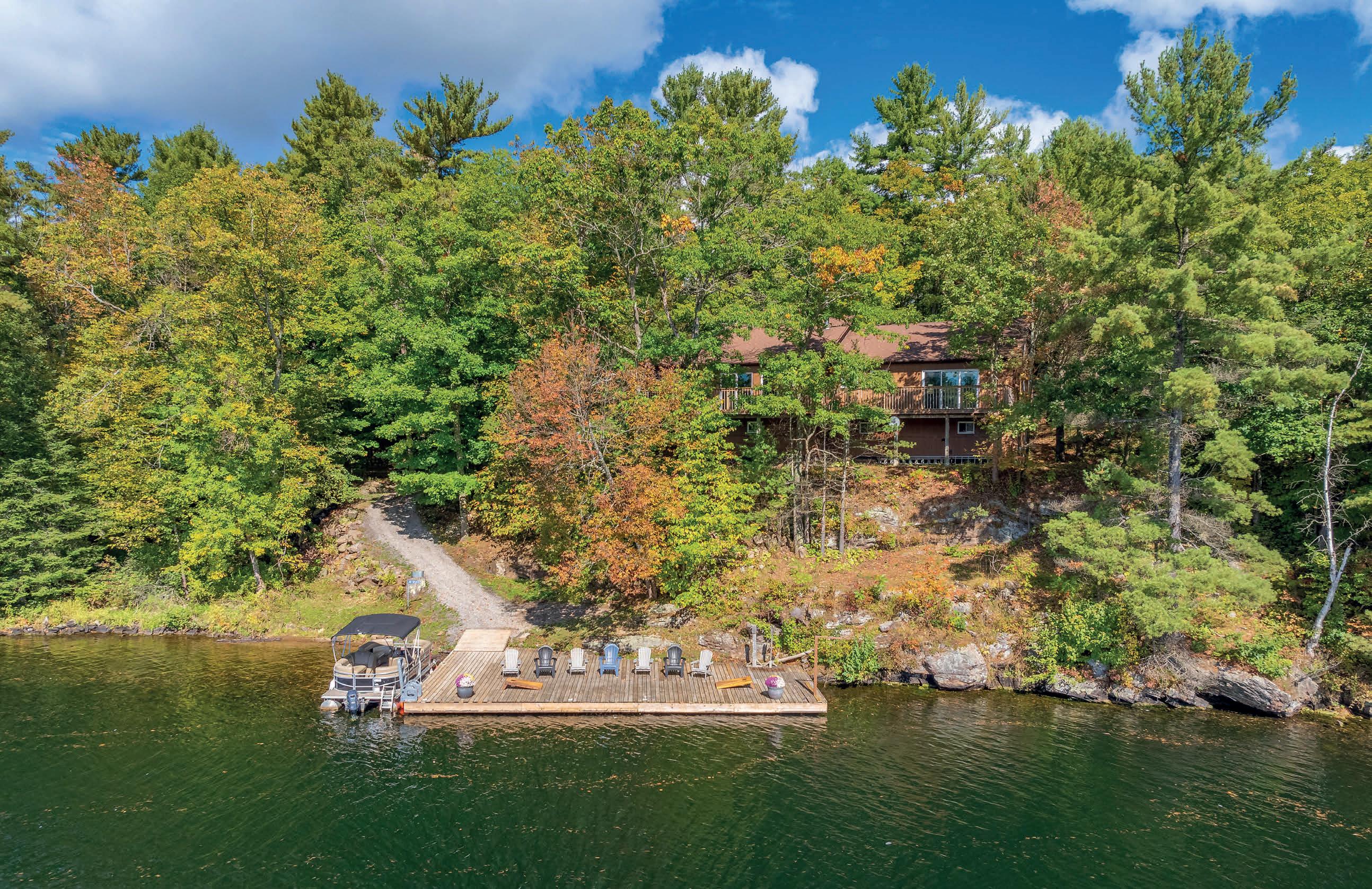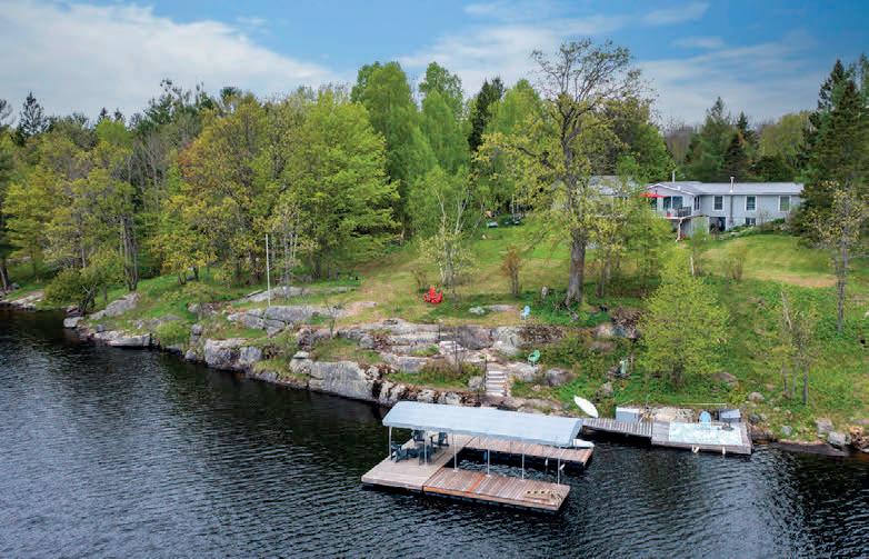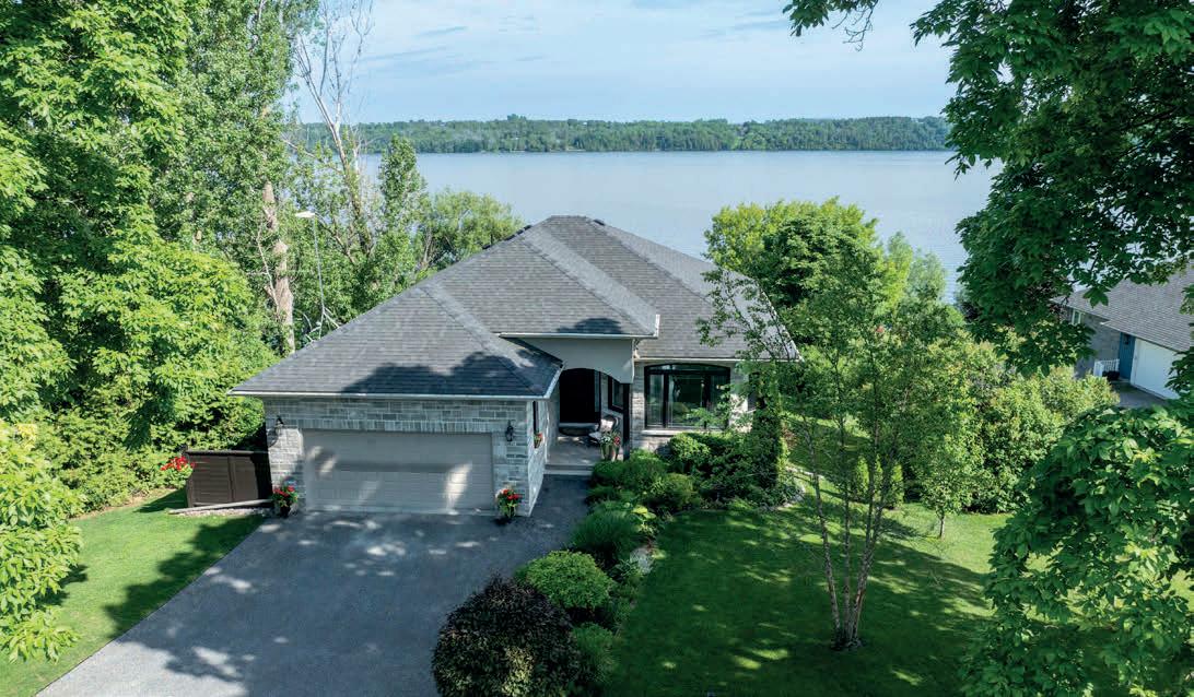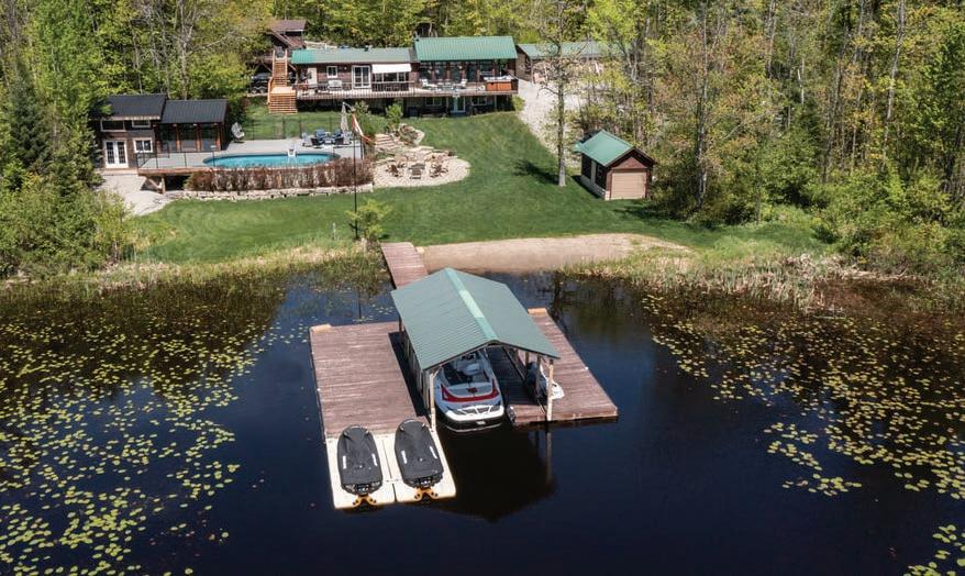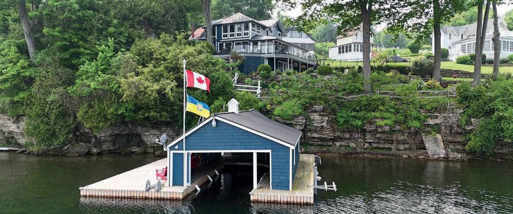 Set on a private peninsula, the property boasts over 550 feet of pristine shoreline on Gloucester Pool, part of the historic Trent-Severn Waterway. Here, deep, clean waters invite endless boating, swimming, and lakeside relaxation. A rare double-slip steel boat port, additional floating dock, and sweeping panoramic views make every sunset unforgettable.