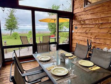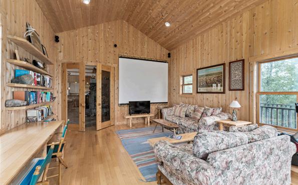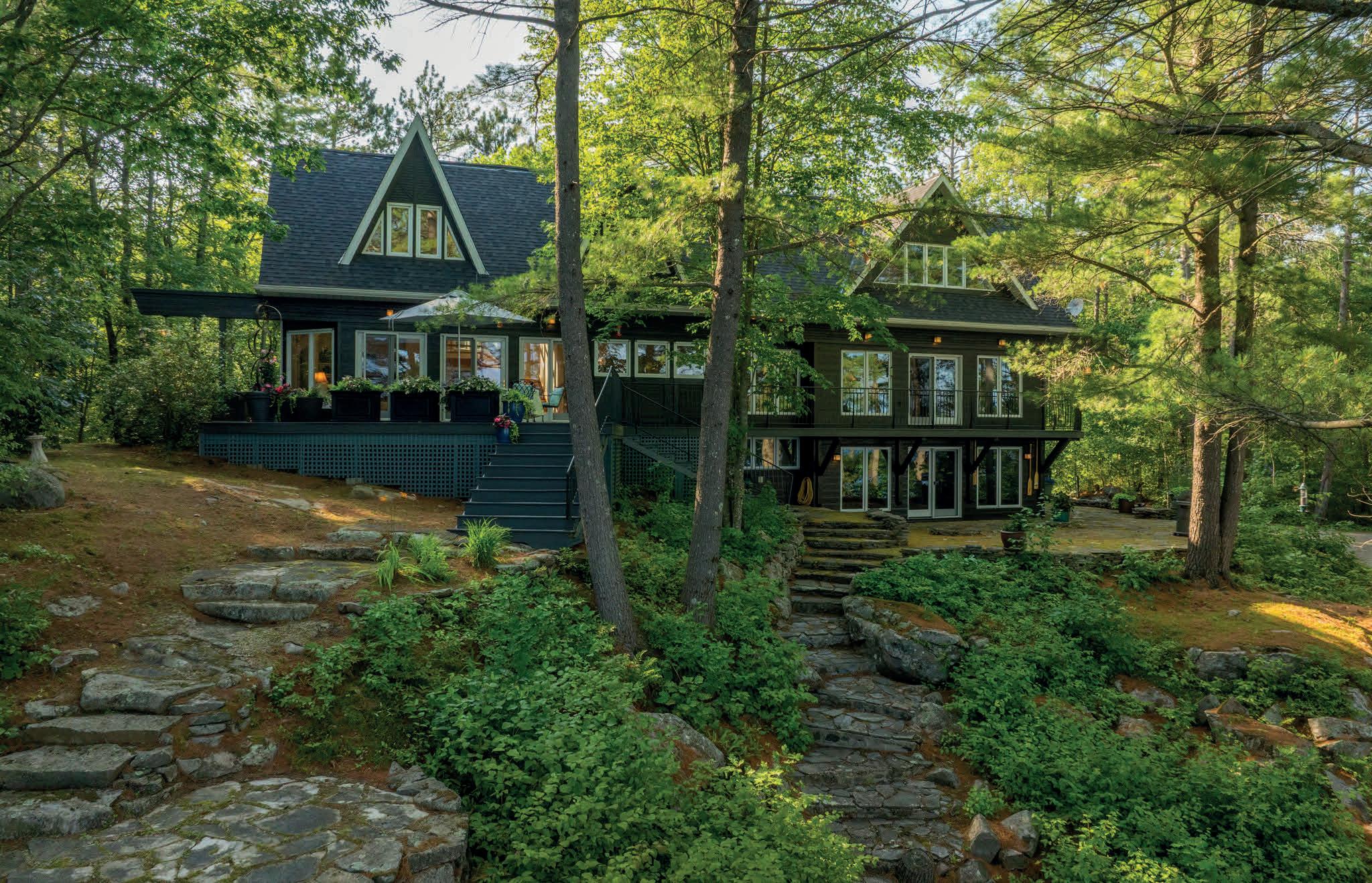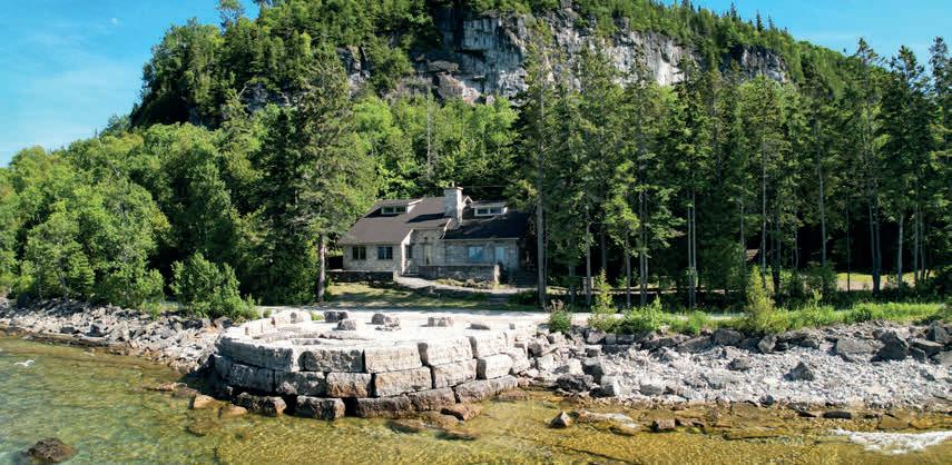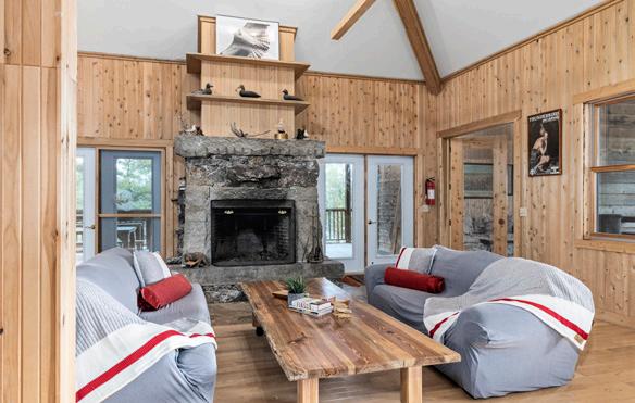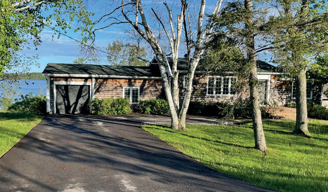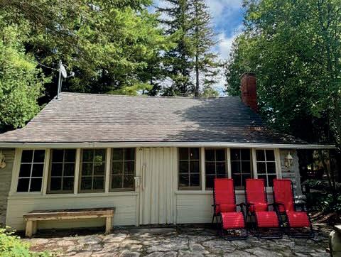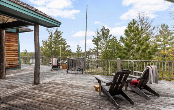 Nestled atop a 100-foot rock cliff sits the majestic cottage and bunk house, designed and built for large family gatherings. The views of the channel below are unparalleled with north-east facing vistas. The main house features 2613 sq ft of open concept living area with a large kitchen, living room with wood burning fireplace and a dining area large enough for the whole family. The main house also includes two large bathrooms, one bedroom, as well as the library and media room off the living room, and the 676 sq ft screened in porch and outdoor kitchen.