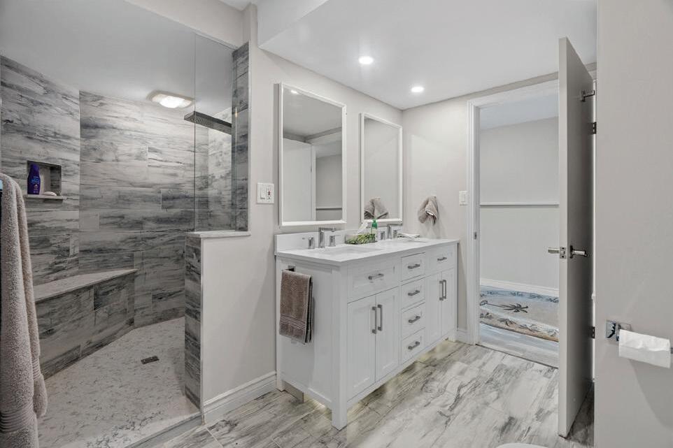 Exquisite tilework elevates every space, while the lower level offers a sauna, home gym, and expansive open area. Outdoors, a saltwater pool and stunning sunroom provide a private oasis.