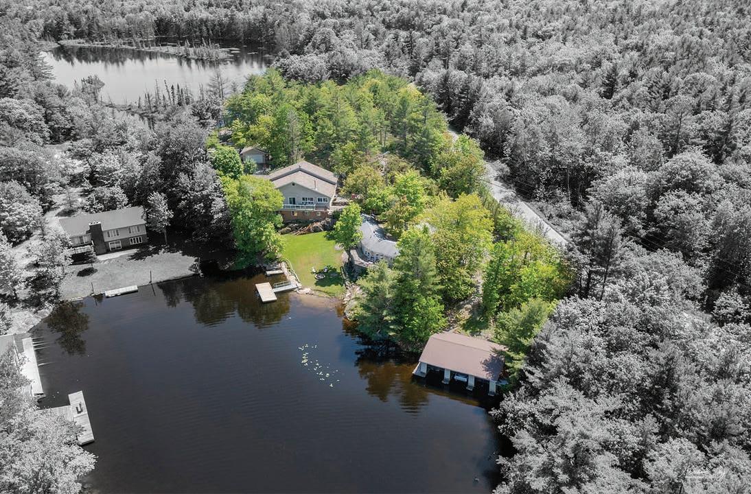 Immerse yourself in the tranquility and elegance of this architecturally inspired home, perfectly nestled into its natural surroundings on the pristine shores of Skootamatta Lake. Thoughtfully designed and recently renovated, this exceptional property offers over 3,300 sq ft of living space that blends comfort, craftsmanship, and waterfront luxury. The main residence captures stunning lake views from nearly every angle. A walkout dining area provides a front-row seat to the water, while the wraparound deck and stone pathways lead you through the serene landscape to the shoreline. The practical yet warm kitchen opens into a welcoming living area that flows seamlessly to the expansive outdoor patio—ideal for entertaining or quiet reflection. Every detail of this home has been curated to support both relaxed living and social gatherings. The main floor primary suite features lakefront views and a spa-like ensuite complete with a soaker tub and steam shower. Additional highlights include a cozy library, a dedicated home office, two fireplaces across separate levels, a sauna, and numerous walkouts that merge the indoors and outdoors. Upstairs, guests will find spacious accommodations with intimate seating areas and panoramic vistas of the property. A detached garage with an upper-level loft provides a beautifully appointed secondary living space—perfect for visiting family or friends. A workshop and parking below lends convenience for the homeowners. Amongst the topography, convenient stone paths guide you to the waterfront. Relax and lounge in this additional seating area or head straight to the dock, for a refreshing swim or utilise it as a launch pad to explore this highly recognised lake. Skootamtata is recognised for its unique topography, abundance of Crown Land, clean deep water, and an expansive area to enjoy all types of waterfront activity. The Land O’ Lakes region is a hidden gem easily accessible from the GTA and Ottawa and provides a waterfront lifestyle that rivals traditional cottage markets. This property exemplifies this position, offering indulgences, practicality and lifestyle that showcase the region and the available opportunities. Welcome to the Land O’ Lakes.