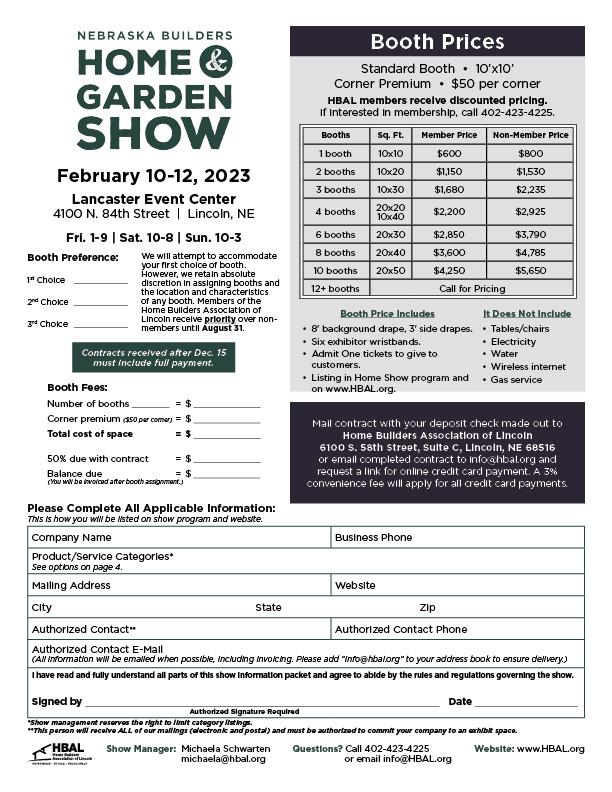 Return this contract to: 6100 S. 58th Street, Suite C, Lincoln, NE 68516 Email: michaela@hbal.org Questions? Call 402-423-4225 Entry Fee: $800 Ad space on lower half of entry page: +$375 Payment is due with contract on January 10, 2023 There is no discount for more than one entry. Credit card payments will incur a 3% convenience fee. January 10 Video Contract Deadline: Payment Due February 14 Video Recording Complete, Photo/Renderings & Bullet Points Due May 14-21 Parade of Homes Dates to Remember Payment accompany contract for submission in the Parade. Name of Entry Company Name Contact Name Email agree to cooperate with the Parade of Homes Committee and to abide by the terms and conditions found on this form. Signature Price/Price Range: With Lot: Without Lot: Number of Bedrooms: Number of Bathrooms: Finished Square Feet: Online Guidebook: The online Guidebook will include a link to a video tour of the home. An additional link to your website can be provided here: Links will go live by the Friday prior to the start of the Parade. Builder Page Proofs Proof(s) of your Parade page(s) will be emailed to the principal member for your company. If you have additional recipients you would like your proof(s) emailed to, please list them below: 2023 Video Spring Parade of Homes Terms & Conditions BUILDER QUALIFICATIONS FOR PARADE PARTICIPATION Builder must be a member to participate in the Parade of Homes. Should a non-member wish to participate they must submit their application for membership along with a contract to enter the Parade of Homes. Participation is open to all builder members in good standing. NON-ENTERED HOMES Any exploitation of the benefits of the Parade for non-entries by any builder member or associate member of this Association will be considered a violation of our Association’s Bylaws. If any builder or associate has any question or doubt about a possible violation, he/she should submit his/her intention to the Parade of Homes Committee for its determination. Violations could result in removal of any entry from the Parade and from possible denial of entry in subsequent years’ Parades, and other action approved by the Board of Directors. Penalties will depend upon the evaluation of each violation on an individual basis and the decision of the Board of Directors. Builder Participants agree to: Video Parade Entry only! 2. Participate with a new home(s) built by the entrant within the last 12 months. 3. Have the entered home(s) videoed by February 14 Call 402-423-4225 or email michaela@hbal.org to schedule. 4. Provide information for the Guidebook by February 14 This includes the price of your home, logo, rendering or photo and 7-10 bullet points describing the home. Renderings must be professional drawings. Renderings/photos and bullet points are subject to approval of the Parade Committee. Member logos should be sent as illustrator or vector art files whenever possible. Acceptable logos include the builder’s company logo and real estate logo. Any other logos are used at the discretion of the Parade of Homes Committee. Guidebook information may be emailed to michaela@hbal.org. Call 402-423-4225 for questions regarding format. The Parade of Homes Committee will provide entrants with: 1. A comprehensive advertising campaign. 2. A two- to three-minute professional video of your home which you can use in future business marketing. A half page in the Parade Guidebook featuring your home and includes a QR code directed to your online video tour. Builders will receive a proof of their page by email we have an email 4. The option to purchase a half page ad below your entry for $375. (This ad must be about the builder’s business only.) 5. An online Guidebook including a link to your video tour will supplement the printed Guidebook. 2023 Spring Video Contract May 14-21 Deadline - January 10
