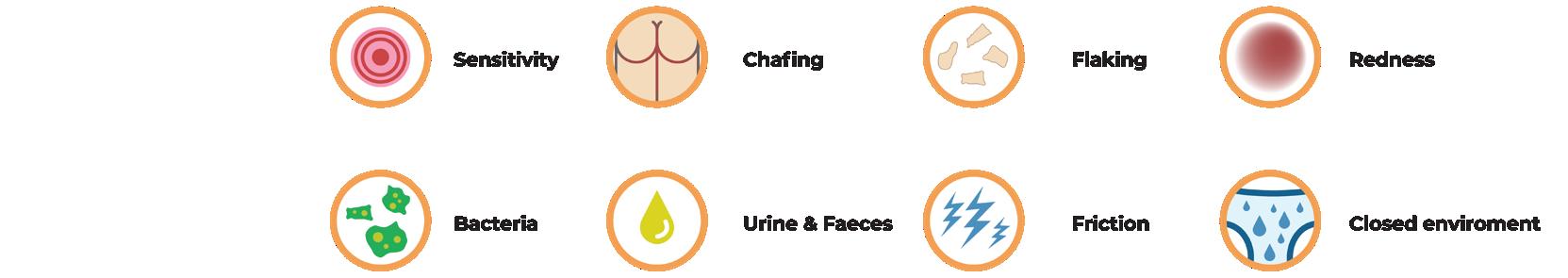 + Chafing, due either to skin rubbing against the nappy, or from skin folds, can damage and irritate the skin.