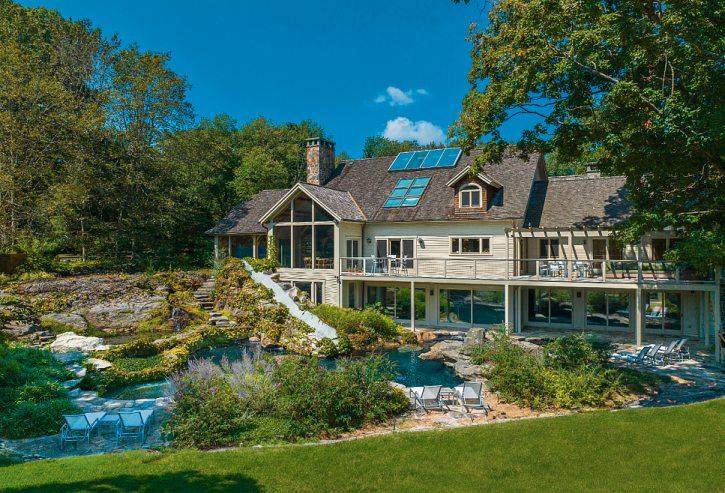 “Aside from breathtaking waterviews and440 feet of direct waterfront,the property hastwo homes: thesix-bedroom main houseand theVermont-style guesthouse/party barn