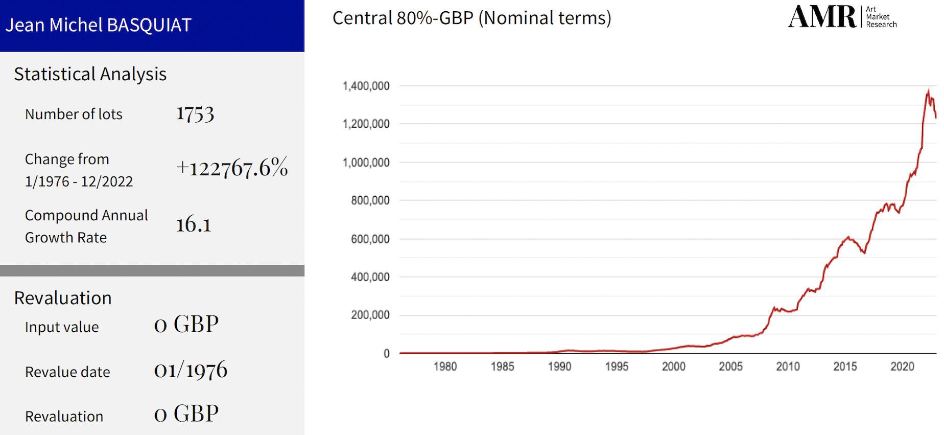 The graphs prepared by Art Market Research show the annual rates of return for a selection of artists: Claude Monet, Jean-Michel Basquiat, and Willem de Kooning.
