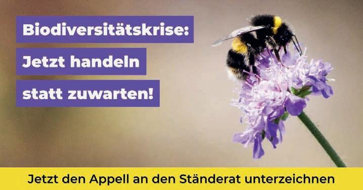 Eine gesunde und vielfältige Natur ist unsere Lebensgrundlage. Sie sorgt für saubere Luft, Bestäubung und fruchtbare Böden. Sie sichert damit auch unsere Ernährung. Dass die Biodiversität in der Krise steckt, hat der Bundesrat erkannt. Er hat dem Parlament einen Gegenvorschlag zur Biodiversitätsinitiative vorgelegt. Der Bundesrat wird vom Nationalrat unterstützt. Auch Kantone, Städte und Gemeinden haben sich dafür ausgesprochen. Eine knappe Mehrheit der zuständigen Kommission empfiehlt je- → w ww.appell-biodiversität.ch