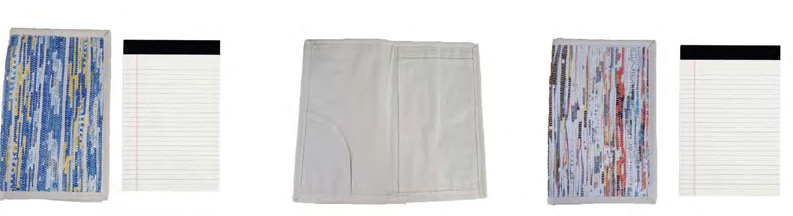 Notebook holder handmade from upcycled plastic using a handloom. Features a notebook and an interior pocket.