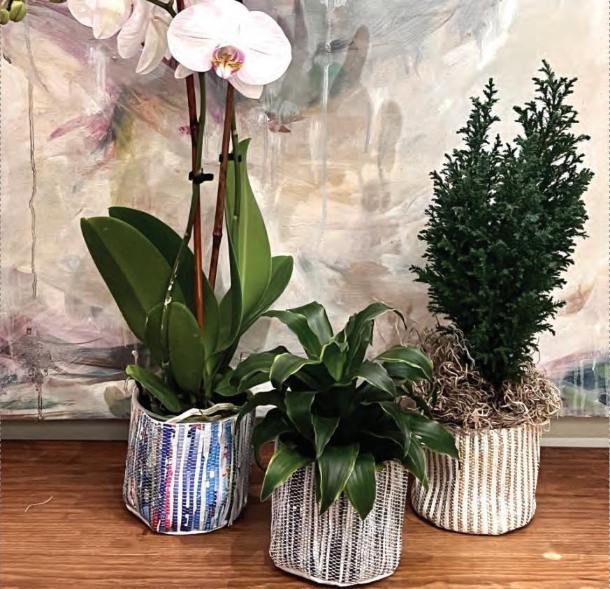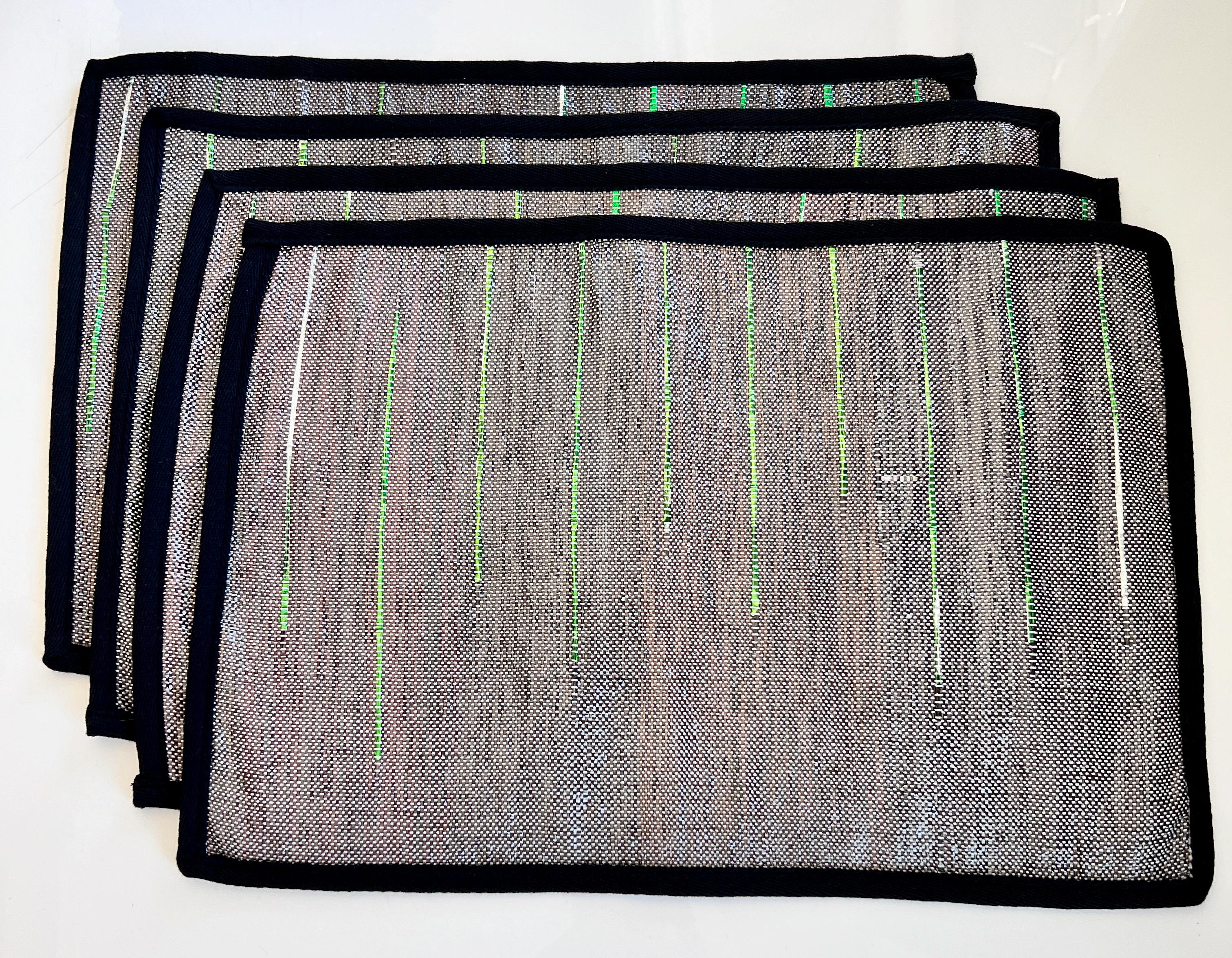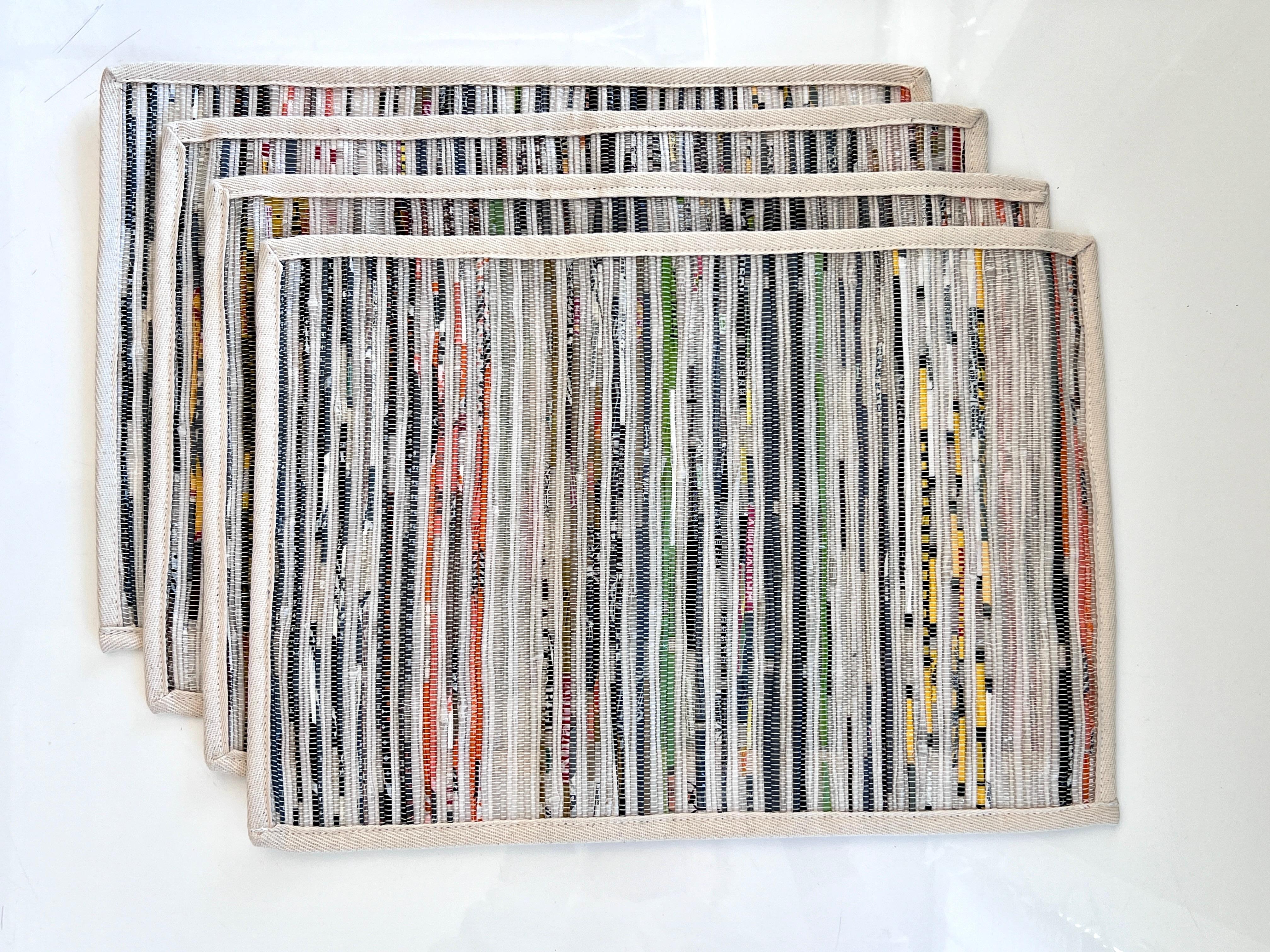 Totally reversable and easy to clean (just wipe off) these placemats are versatile and functional. Woven from upcycled plastic waste such as shopping bags, snack packages, vinyl banners, balloons, and old audio-video cassette tapes.Trimmed with cotton.