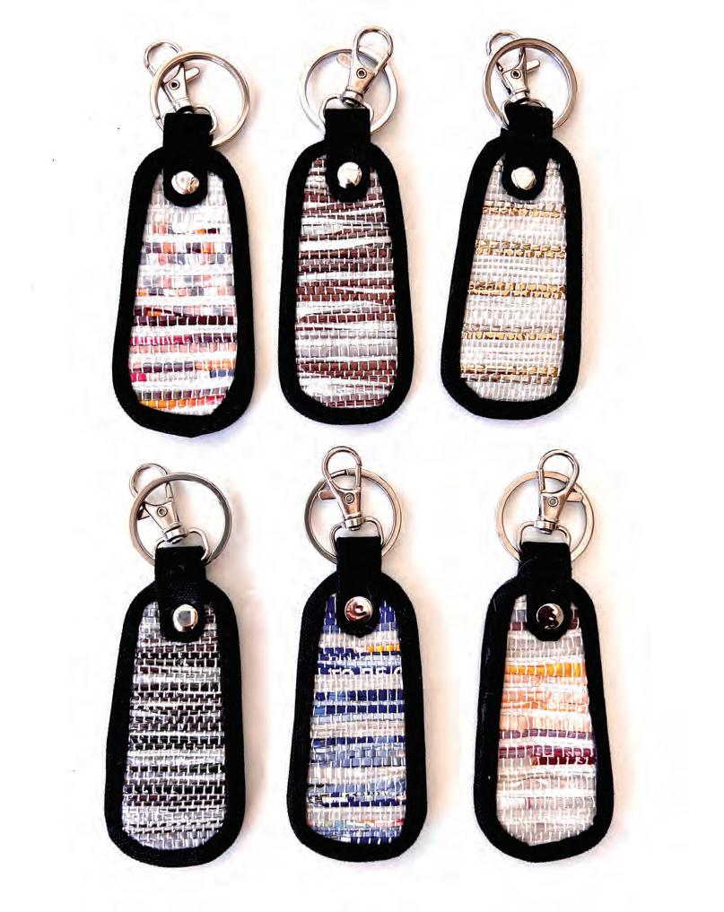 The woven plastic on these cute little key chains is made from upcycled plastic waste, such as shopping bags, snack packages, vinyl banners, balloons, and old audio-video cassette tapes. A ring keeps your keys secure and a snap hook allows for easy attachment to purses, belts, etc.