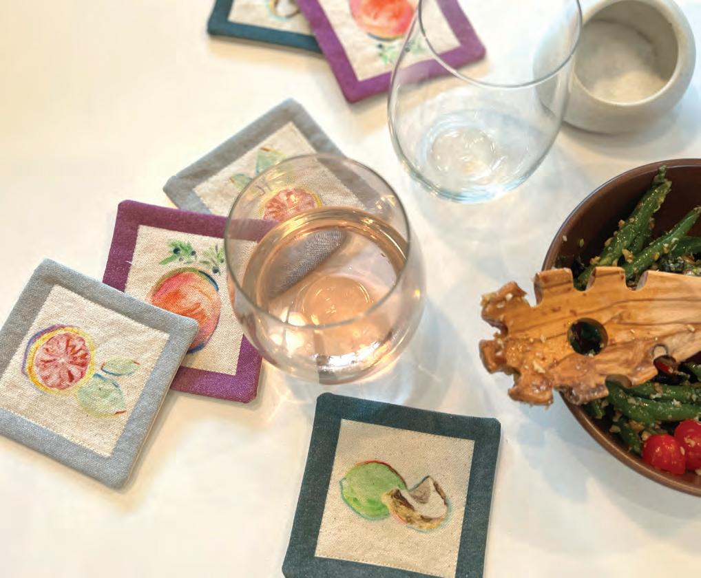 Create a rich, lively, and bright table by bringing the garden inside. 100% organic cotton canvas coasters constructed by artisans at a social enterprise in India. Every beautiful piece is fair trade, and the artwork and designs were created in our Chicago studio with watercolor and oil pastels.