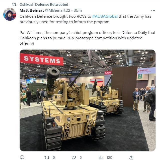 HUNTSVILLE, AL. (March 28, 2023) Oshkosh Defense LLC, an Oshkosh Corporation (NYSE: OSK) company, is exhibiting at the Association of the United States Army (AUSA) Global Force Symposium (GFS) 2023 in Huntsville, AL. from March 28-30. On display will be two Robotic Combat Vehicles (RCV) demonstrating leading-edging technologies in autonomy, teleoperation, and weapon system integration.