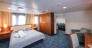 Deck five: picture windows, unobstructed view; matrimonial bed, sitting area — approx. 270 sq. ft. Deck seven forward: forward-facing picture windows, unobstructed view; matrimonial bed, sitting area, private bath with full tub, refrigerator— approx. 290 sq. ft.