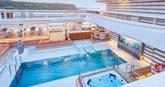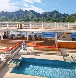 a 180-degree panoramic view and a well-stocked bar with library. Or how about a drink at the pool? Always served with the very best views of stunning landscapes. The crew also provides special moments in extraordinary places, such as enjoying a glass of champagne in the Zodiac.