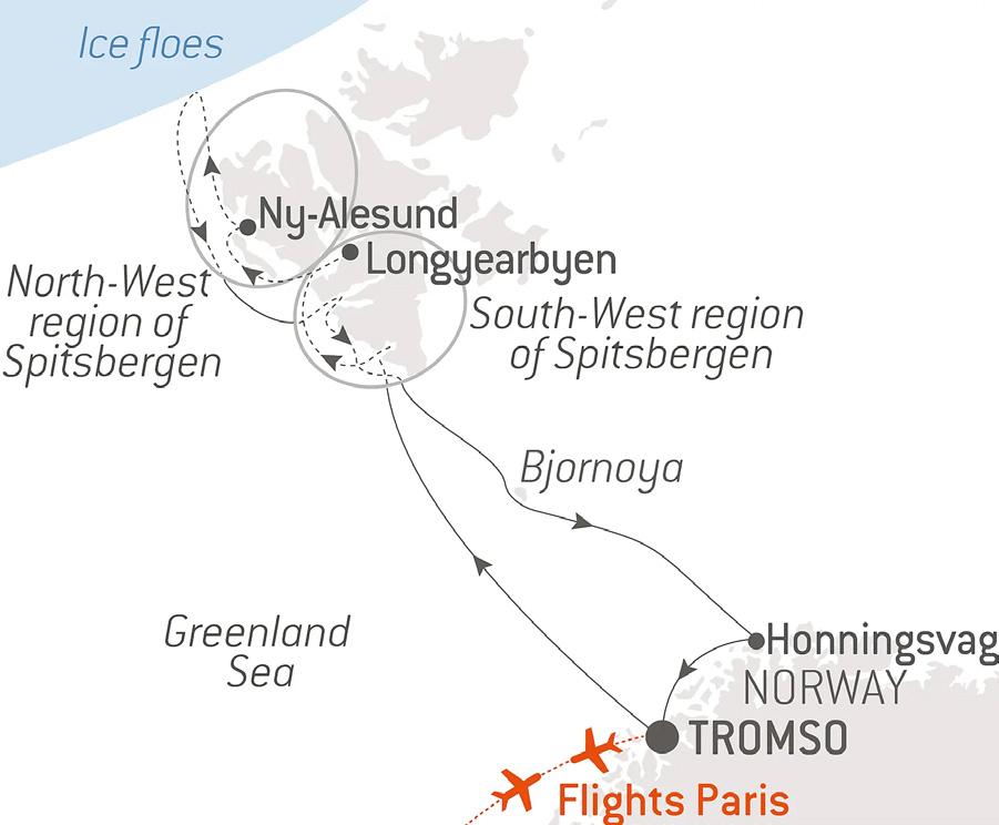 Included in your voyage(2): flights Paris/Longyearbyen and transfer before embarkation.
