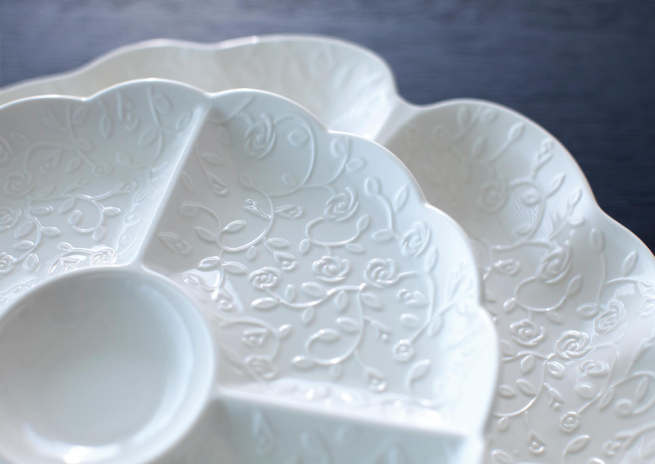 Un ricamo d'argento adagiato sulla purezza del vetro e della porcellana, la luce che scivola sul metallo, si nasconde tra le geometrie della decorazione, e riappare per colpire gemme colorate e continuare il suo gioco.