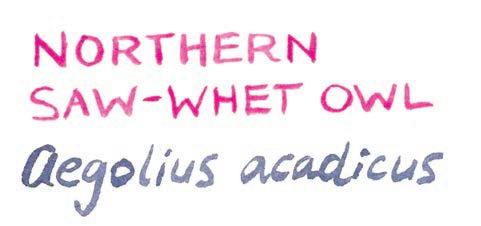 us understand the owl’s age, since new feathers contain large quantities of pigments called porphyrins that cause feathers to fluoresce under black light, while older feathers don’t glow as much. We determine that this saw-whet is a hatch-year owl since her feathers are bright pink under the ultraviolet light. Once LeJay and Cheyenne record all the information they need, we take the owl outside and set her on a fence post. She looks around for a while as she reorients, then soundlessly zooms straight up in the air like a