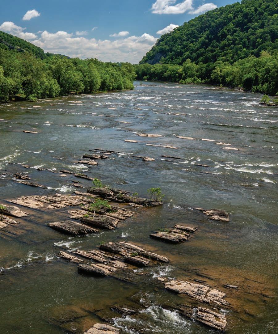 Clockwise from left: A towering tulip poplar rises through the green tunnel of the Appalachian Trail. The Shenandoah River drops over a series of rocky ledges before its confluence with the Potomac at Harpers Ferry. A pair of thru-hikers saunter through Harpers Ferry National Historical Park—the psychological halfway point of the Appalachian Trail. Previous: Jefferson Rock, an impressive viewpoint from which Thomas Jefferson declared, “It is worth a voyage across the Atlantic.”