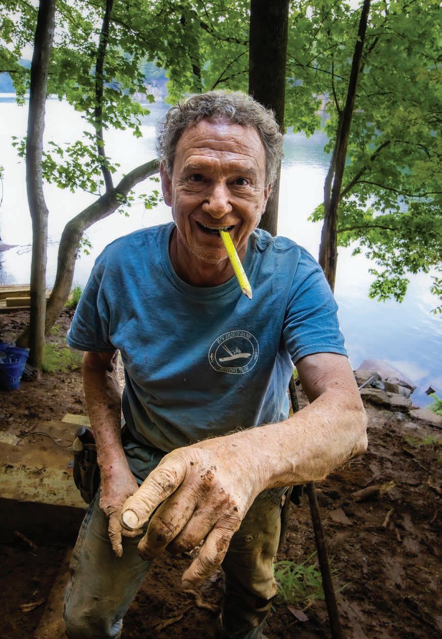 Left: The man, the myth, the legend, the author: Gene Kistler. Photo by Jay Young. Right top: Volunteers use a “come along” winch to move massive rocks. Photo by Karen Lane. Right bottom: (Not) workers slide a 400-lb paver stone down a slide. Photo by Jay Young. Previous: Volunteers form a rock brigade to shore up rock climbing access on Summersville Lake. Photo by Jay Young.