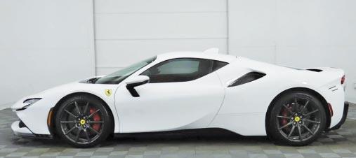 2023 Ferrari SF90 Stradale- White over red leather, 986 hp 4.0 liter twinturbo V8 hybrid, 8-speed F1 auto trans, 107 miles, carbon fiber interior trim, special paint, horse stitched to headrests, front axle lift, carbon brakes, yellow calipers, black ceramic exhaust. $619,900 Stock #PC8661UCP Pagani Beverly Hills (310) 484-5837