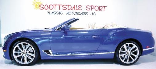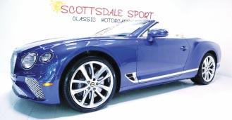 2020 Bentley Continental GTC Convertible- Moroccan blue over linen leather, 4.0 liter V8, AWD, 5,230 miles, 8-speed auto trans, Mulliner package, Bang & Olufsen premium audio, rotating display, city specification, 22” premium alloy wheels, wings embroidered to headrests, black calipers. Scottsdale Sport & Classic Motorcars Indoor Showroom (480) 596-1611 www.scottsdalesport.com