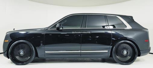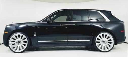 2019 Rolls-Royce Cullinan Mansory- Navy blue over navy blue leather, 6.8 liter twin-turbo V12, 8-speed auto trans, AWD, 7,777 miles, Mansory body kit, carbon fiber exterior trim, RR embroidered to headrests, contrast interior piping, rear captains chairs, panoramic sunroof, premium Mansory alloy wheels. $334,900 Stock #PC3790 Pagani Beverly Hills (310) 484-5837