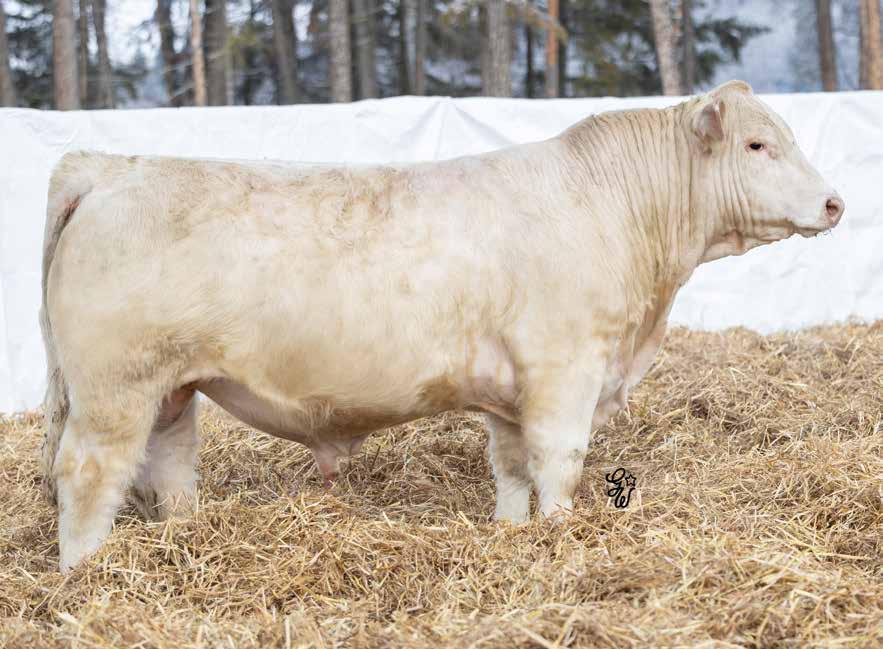 Moderate framed calving ease option in this White Bear son. We purchased him “in dam” from the Wrangler Charolais dispersal and we are very happy with how he has developed. He’s very smooth made, with a great shoulder, and is very clean through his front end. With just a moderate 82lb Birthweight he also has tons of muscle shape and depth of body.