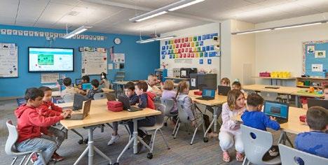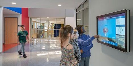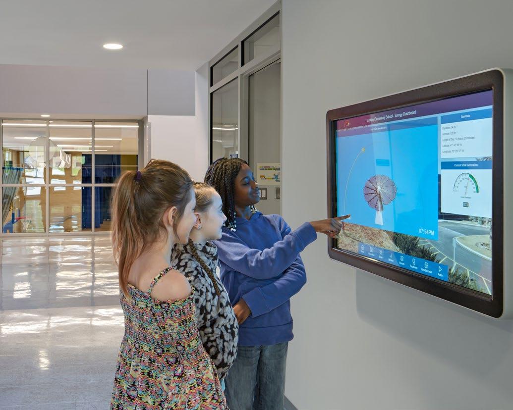 An energy dashboard located in the lobby of Buckley Elementary School in Manchester, Conn. displays real-time energy output and usage of the school, and is used as a teaching tool for students. The school was recently verified by the New Building Institute (NBI) as the first Net Zero Energy Public School in New England. / Photo courtesy of TSKP Studio / Read full story on page 25
