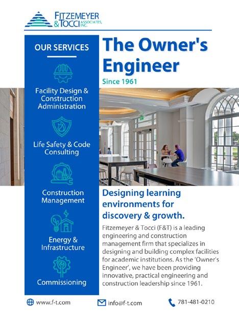 www.high-profile.com March 2024 4 On the Cover: Featuring: ADVERTISERS INDEX WOMEN IN CONSTRUCTION INDEX SUBSCRIBE ONLINE: www.High-Profile.com/subscribe PUBLISHER: Anastasia Barnes EDITOR: Emily Langner CONSULTING EDITORS: Ralph Barnes and Marion Barnes ART DIRECTOR: Yvonne Lauzière, Stark Creative ACCOUNT EXECUTIVE: Mark Kelly FOUNDERS: Michael and Kathy Barnes Send news releases, advertising queries, articles, announcements, and calendar listings, to: editor@high-profile.com P.O. Box 7, Pembroke, MA 02359 (781) 294-4530 Catching Up with Michael A. Nieminen of SCUP North Atlantic 10 25 Milestone Construction Transforms Former Bank into Early Learning Center 22 Alpine Environmental 30 Amenta Emma 22 American Energy Management 25 American Plumbing & Heating 2 Annum Architects 6 Arden Building Company 15 Associated Subcontractors of Mass 8 Barnes Building Management 31 Brennan Consulting 7 Copley Wolff Design Group 22 Dietz & Co. 23 Dimeo Construction 17 e2 Engineers 33 Energy Electrical Contractors 37 Erland Construction 26 Fitzemeyer & Tocci 18 G.T. Wilkinson 36 Gate City Electric 28 Genest 3 Granite State Plumbing & Heating LLC 29 Gray, Gray & Gray 6 Hampshire Fire Protection 32 IBEW 103 9 J&M Brown 23 Jones Architecture 8 Kaplan Construction 24 Kaydon 21 Metro Walls 35 Milestone Construction 16 Margulies Perruzzi Architects 24 NEMCA 35 Norgate Metal, Inc. 32 O’Reilly, Talbot & Okun, Assoc. 6 O&G Industries 12 Optiline Enterprises 28 Procon 5 Rasky Partners 39 Silver Tiger Consulting 33 SL Chasse 19 Sprinkler Fitters Local 550 43 Suffolk Construction 44 Tecta America 4 TFMoran 30 Topaz Engineering 27 Weston & Sampson 13 28 Construction Well Underway on Wakefield Thermal Expansion 41 Jones Architecture Announces New Partners Publisher’s Message… 6 Up-Front… 7 Schools and Institutions… 10 Restoration and Renovation… 27 Northern New England… ................. 28 Mixed-Use… 30 Multi-Residential… 32 Industrial… 33 Corporate… 34 Municipal… ........................................ 34 Trends and Hot Topics… 35, 36 Organizations and Events… 37 Awards… 38 People… 40 Calendar… 42 Sections: Manchester School Verified as First Net Zero Public School in New England Locally operated for over three decades with nationwide strength, Tecta America New England is Roofing Redefined. Commercial/Industrial Roofing • Tecta America NE was formerly Delta Roofing • tectaamerica.com N. Billerica, MA 800-398-1380 Brockton, MA 866-583-9499 Portland, ME 207-878-1732 E. Hartford, CT 860-828-0380 Tecta America WeatherGuard, Schenectady, NY 800-287-0442 New Construction Roofs Roof Replacement • Repairs 24/7 Emergency Response Preventative Maintenance Rooftop Safety Assessments FULL SERVICE COMMERCIAL ROOFING: # #1 ROOFER ON BOTH LISTS Altieri 16 Associated Subcontractors of Mass 7 Bald Hill Builders 23 BTEA Northeast 5 BW Kennedy 18 CHA Consulting 6 Copley Wolff 22 Dacon 19 Dellbrook|JKS 13 DEW Construction 24 Dimeo 2 Epsilon Associates 20 Erland Construction 7 Florence Electric 10 Folan 27 Griffin Electric 21 IBEW 103/NECA Greater Boston 15 Interstate Electrical Services 9 N.A. Manosh Corp. 3 O’Reilly, Talbot & Okun 26 Plumbers Local 12/Greater Boston PCA 28 ReArch Company 11 TFMoran 6 TSKP STUDIO 17 Weston & Sampson 8 W.L. French 25