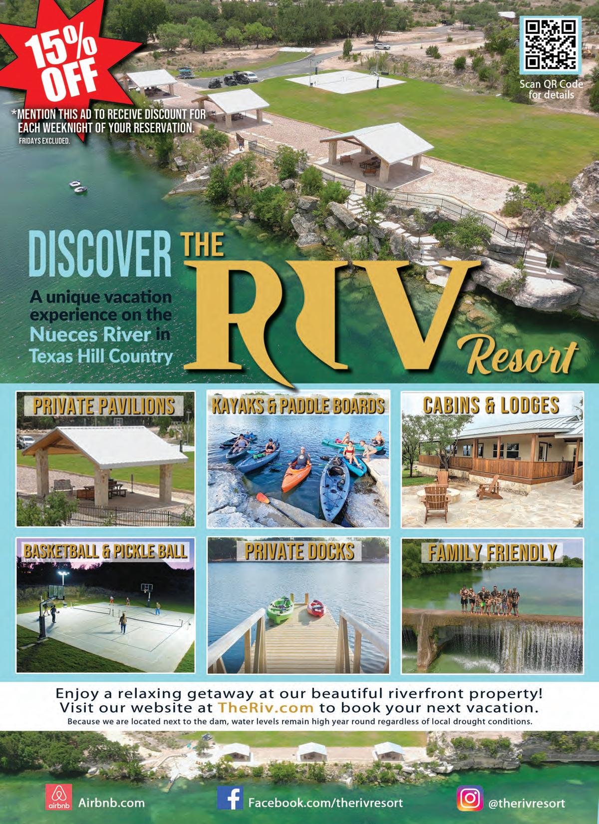June/July/August 2023 Hill Country SUN 3 ELEVATE YOUR EXPERIENCE of the Frio Canyon and choose Frio Premier/Frio Select for your river vacation stay. Enjoy luxury amenities as you make memories to last a lifetime with your family and friends at the Frio River! FrioRentalHomes.com Casa El Roble Hill Country Hideaway Mountain View Manor El Ranchito Ryder’s Ridge Frio Ridge Retreat 830-232-4935 830-333-6233 Call our office for WEEKDAY SPECIALS! Visit our website for REDUCED SUMMER RATES on several homes!