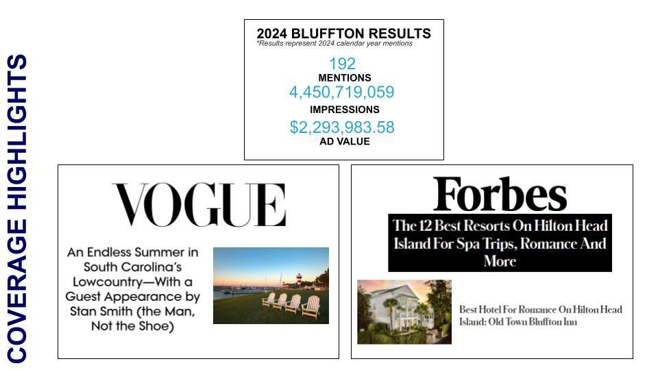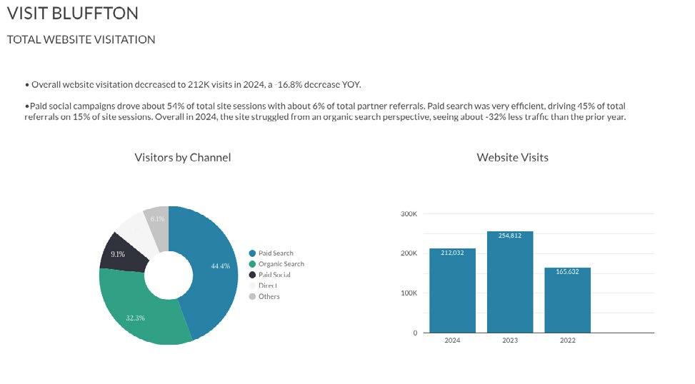 The Hilton Head Island-Bluffton Chamber of Commerce/Visitor & Convention Bureau continues to be the leader in promoting tourism for Bluffton. The organization as a whole utilizes national economic and tourism trends, consumer research, prior program performance, and demographics and takes into consideration the needs of our community (residents and businesses) to be in the best position as the steward of the destination.