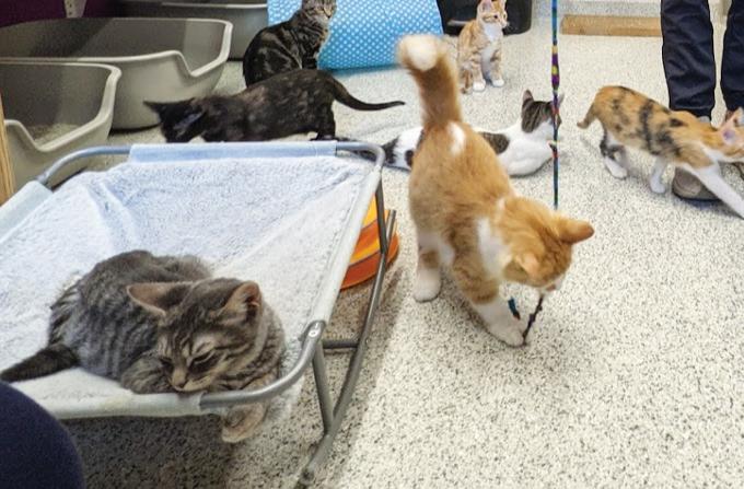 A VOLUNTEER PLAYS WITH KITTENS INSIDE THE CENTER.