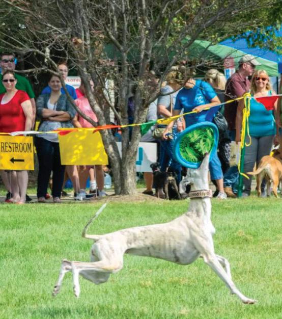 A GREYHOUND PLAYS AT THE ANNUAL WEST SUBURBAN HUMANE SOCIETY BARKAPALOOZA EVENT, HELD AT LISLE COMMUNITY PARK.