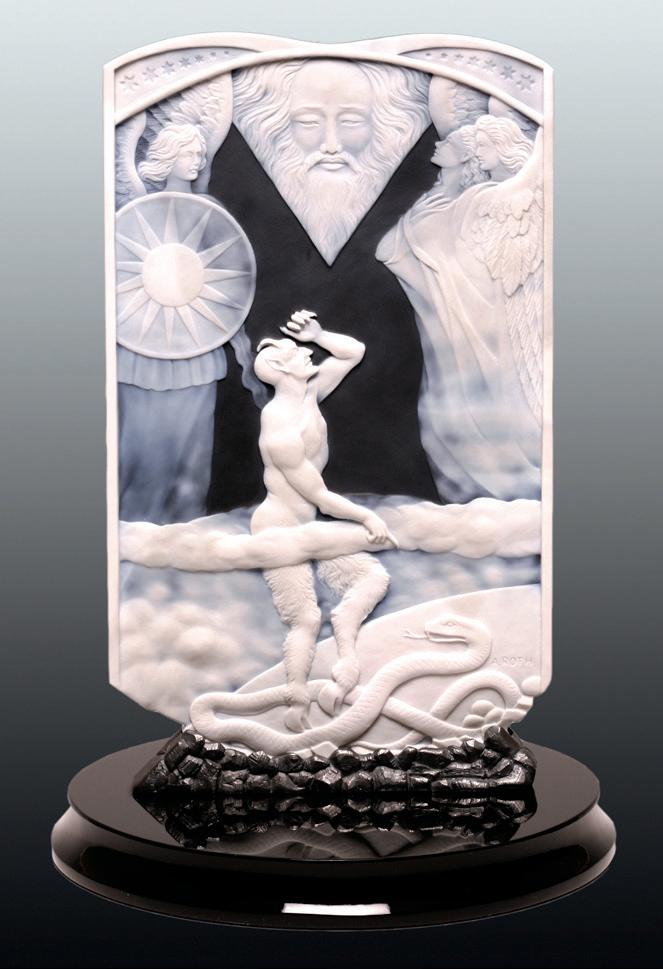 German legend about a man who sells his soul to the devil for unlimited knowledge. The scenes are realistically portrayed. The last cameo “Faust Without an End” is the largest two-sided cameo in the world, nearly two-feet high.