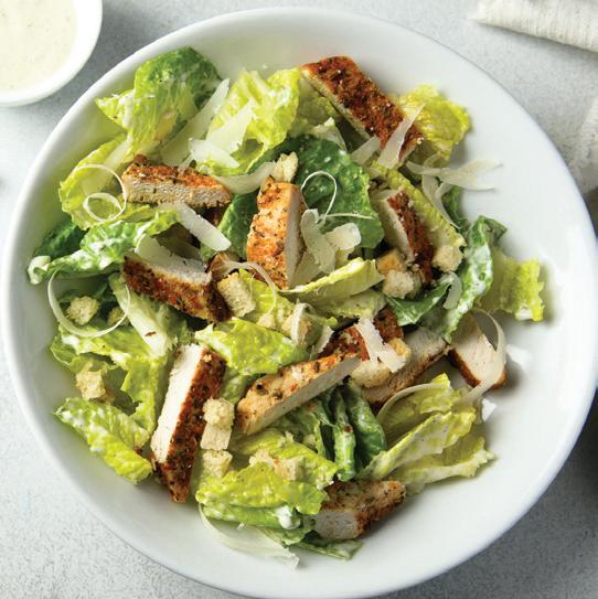 Caesar salad can serve as a starter or the star of any lunch or dinner, whether in its pure form – crisp romaine lettuce accented with the garlicky goodness of Caesar dressing and the salty, nutty flavors of shaved Parmesan – or topped with grilled chicken, shrimp, or salmon.