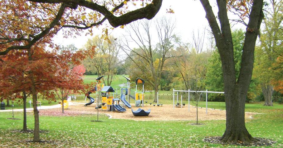 Hooper’s Hollow is a large park tucked neatly at the intersection of Chicago Avenue and Cornell Avenue. Generally a quiet neighborhood park, it has a walk path and features new playground structures for the young and old. The park rises steeply from south to north and a wooden bridge spans over the creek providing pedestrian access to the northern half of the park. Photo courtesy of The Downers Grove Park District