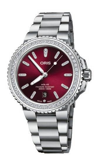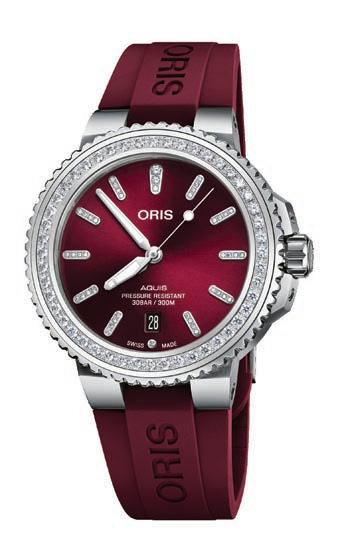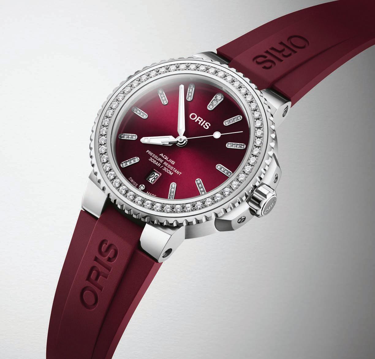 Behind these precious stones, the watch has a 41.5 mm stainless steel case, a cherry red dial, an automatic mechanical movement and either a stainless steel bracelet or a cherry red rubber strap. It’s water-resistant to 30 bar (300 metres).