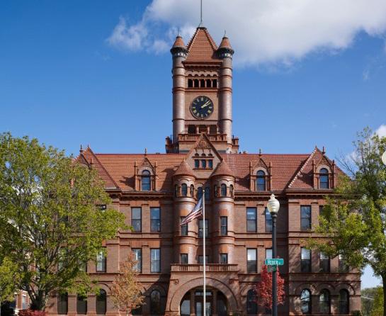 This building, opened in 1896, replaced the original structure from 1868. It was built on land purchased from Warren L. Wheaton and is one of the rare Richardsonian Romanesque styles in northern Illinois. The duration of this design was short-lived as buildings of this type were expensive to construct. The red brick exterior features a bell tower and multiple turrets. These details are deliberate to remind the community of the purpose of defending law and justice. The tower was struck by lightning in 1988 but was rebuilt. The building served as the DuPage County Courthouse until a new building opened in 1990.