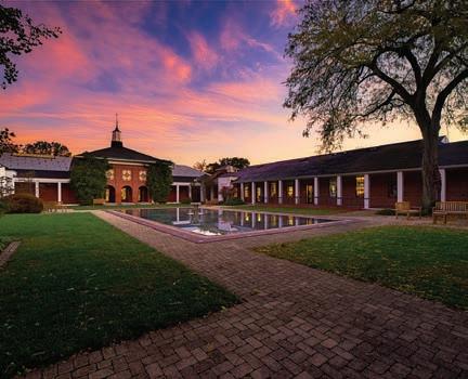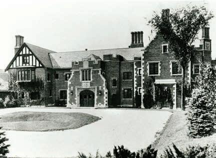 This Tudor Revival style estate was designed by the Marshall & Fox design firm and was built between 1919 and 1922. The estate, located on 87 acres of nature preserve and wetland, was a country home for the family of wealthy coal magnate Francis Stuyvesant Peabody. It was loosely modeled after a country estate in Warwickshire, England. Tall, narrow windows, half-timbering, high ceilings, and an abundance of carved walnut wood are hallmarks of the home. A wildflower garden grows outside of Portiuncula Chapel, a miniature replica of St Francis Church in Assisi, Italy. After Peabody’s death in 1922, the home and estate were sold to the Franciscan Order.