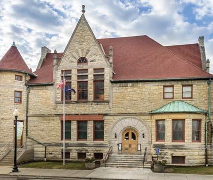 The museum is housed in the former Adams Memorial Library and was designed by Charles Sumner Frost, who also designed the town’s railroad station. The library was named after its donor, real estate developer and miller John Quincy Adams, who was the fourth cousin of President John Quincy Adams. The building re-opened as The DuPage County History Museum in 1967. The architecture is of Richardsonian Romanesque style – distinguished by rough-hewn stone blocks, horizontal lines, wide-rounded arches, and detailed ornamentation. Each façade has a tall stone gable with pinnacles on either side near the base. Each gable has an arched window. Inside, the main hall features marble and oak wainscoting, oak floors, and plaster ceilings.