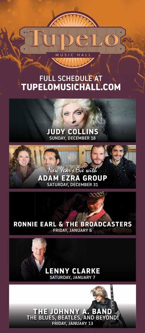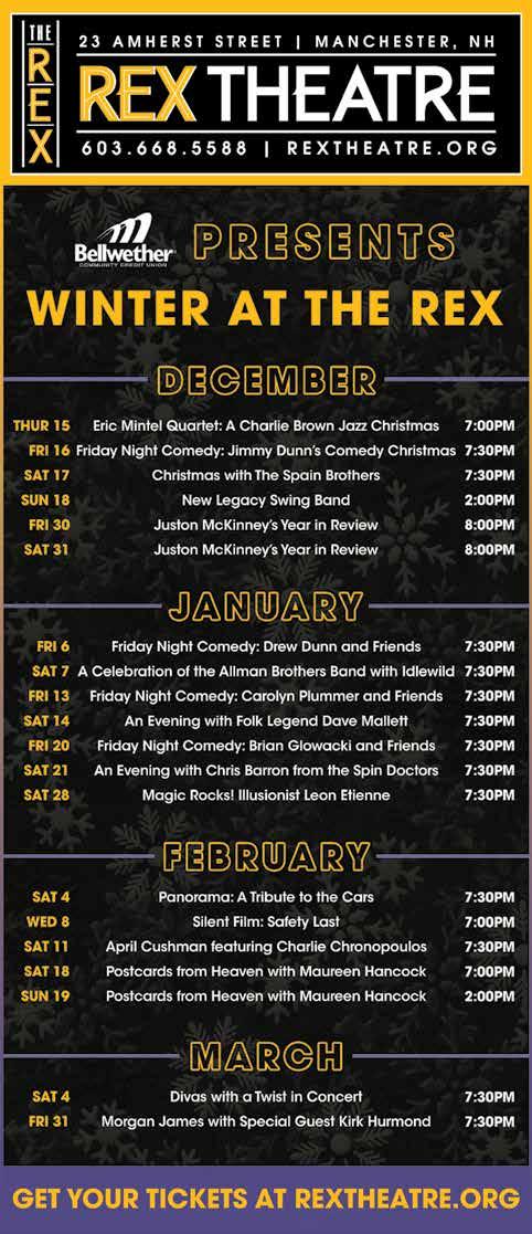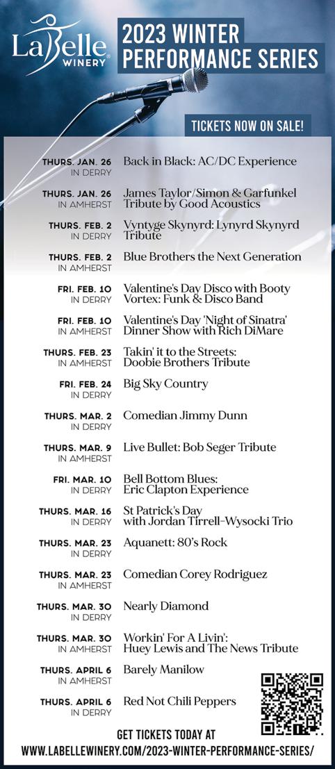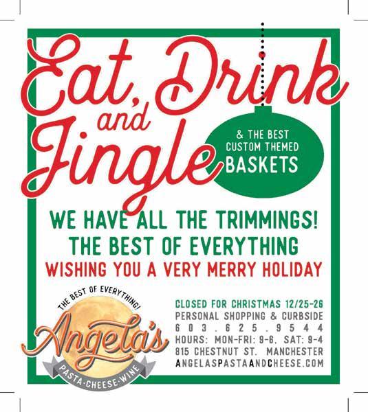AlSO ON THE cOvER Celebrate 2023 with NHSCOT’s Hogmanay, a traditional Scottish New Year’s celebration, at LaBelle Winery in Derry (page 14). Loon Chocolate and 603 Charcuterie present a two-day holiday market filled with all kinds of last-minute gift-giving opportunities (page 25). It’s the end of an era for Manchester’s culinary scene, as longtime chef Edward Aloise and his wife, Claudia Rippee, owners of Republic Cafe and Campo Enoteca on Elm Street, get ready to step away from the kitchen and enter retirement (page 24).