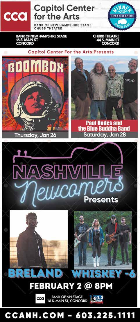 Last Week’s Answers: Puzzle a Puzzle B Puzzle C sudoku answers from pg36 of 1/5 Gift Cards available for all occasions! 138794 BOGO Buy One, Get One FREE! Used CDs! NO LIMIT! Ends 1/31/23 - Lower cost item is free 1711 South Willow St. Manchester 603-644-0199 • musicconnection.us Open 7 Days 1181 Elm St. Manchester NH 03101 603-641-3276 139426 1/2 PRICE WELL DRINKS 7 days a week 9pm - 11pm HAPPY HOUR FOOD Mon - Friday 2 - 5pm EVENTS MONDAY: (all day) Kids Eat Free TUESDAY: Teacher Tuesdays 25% Discount for Teachers! Taco Tuesday WEDNESDAY: Trivia 8 - 10pm ($9.95 Burger Night) THURSDAY: Karaoke (50 cent wing night) 9 - Close FRIDAY: Karaoke 9 - Close SATURDAY: Alex Cormier / Open Mic 8-Close SUNDAY FOOTBALL (50 cent wings and 3$ Bud products) BOOK FUNCTIONS FOR ANY OCCASION! ScampsComedy.com/shows COMEDY EVERY SATURDAY 8 p.m. in the back pub Murphy’s Taproom 494 Elm Street, Manchester Sat., Jan. 14 CD: Having a Nice Time ANDREW MAYER Tickets $20 With: Will Smalley Eric Hurst And Special Guest: Mike DuPont 139408 2B Burnham Road | Hudson, NH (603) 943-5250 www.facebook.com/TheBar.Hudson Live entertainment every Friday & Saturday! Find our live music on Facebook! 136210 Great after work hangout, fantastic food. 5 Stars on Restaurantji.com
