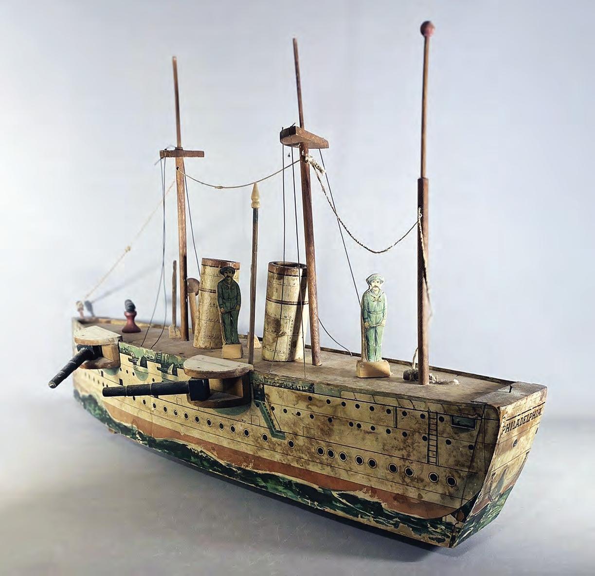 THIS 1890S TOY Battleship Philadelphia was made by the Rufus Bliss Company of Pawtucket, R.I. The body of the warship was wood, and is covered with detailed colored lithographs. The vessel, nearly 32 inches long and about 6 inches wide, was equipped with wheels so it could be towed.